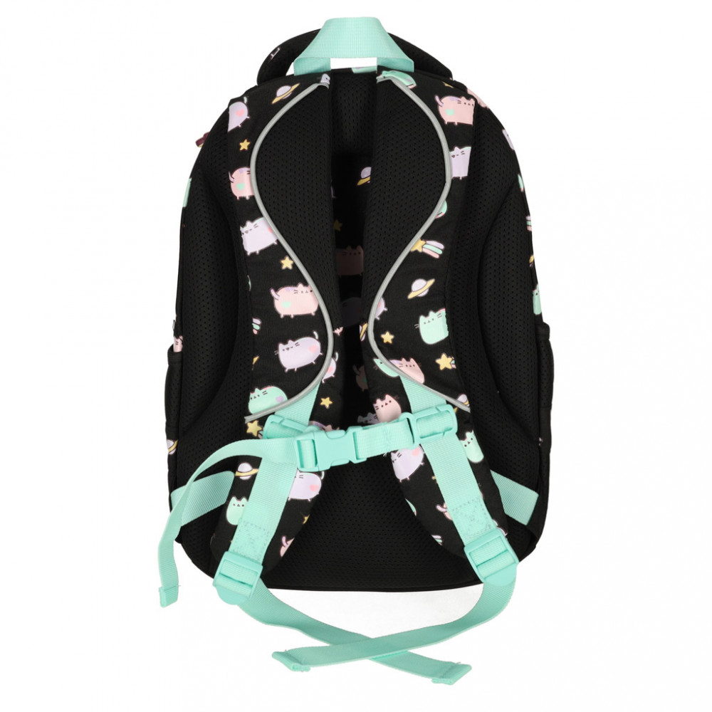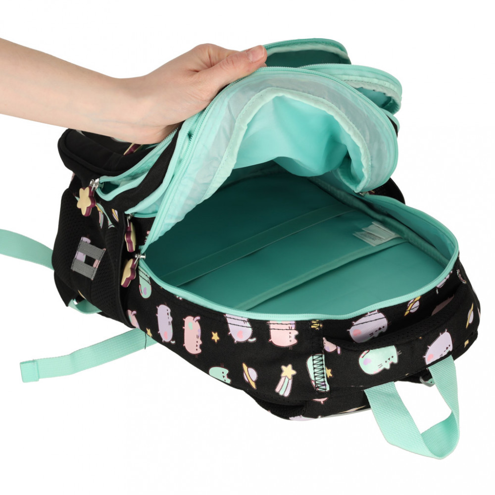 A hátizsák négy fő rekesszel és két zsebbel rendelkezik egy palack víz vagy a kedvenc gyümölcslé számára. A hátizsák belsejében kisebb rekeszek is találhatók különböző apróságoknak - zsebkendőnek, kulcsoknak vagy más fontos dolgoknak.Párnázott háttal és puha merevítőkkel rendelkezik, amelyek javítják a hordozási kényelmet, és segítenek a helyes testtartás fenntartásában is. A cipzárak gumicsillagokkal vannak ellátva - apró részlet, de szemet gyönyörködtető. A Pusheen macska díszíti a hátizsákot, és egyedi jelleget kölcsönöz neki.