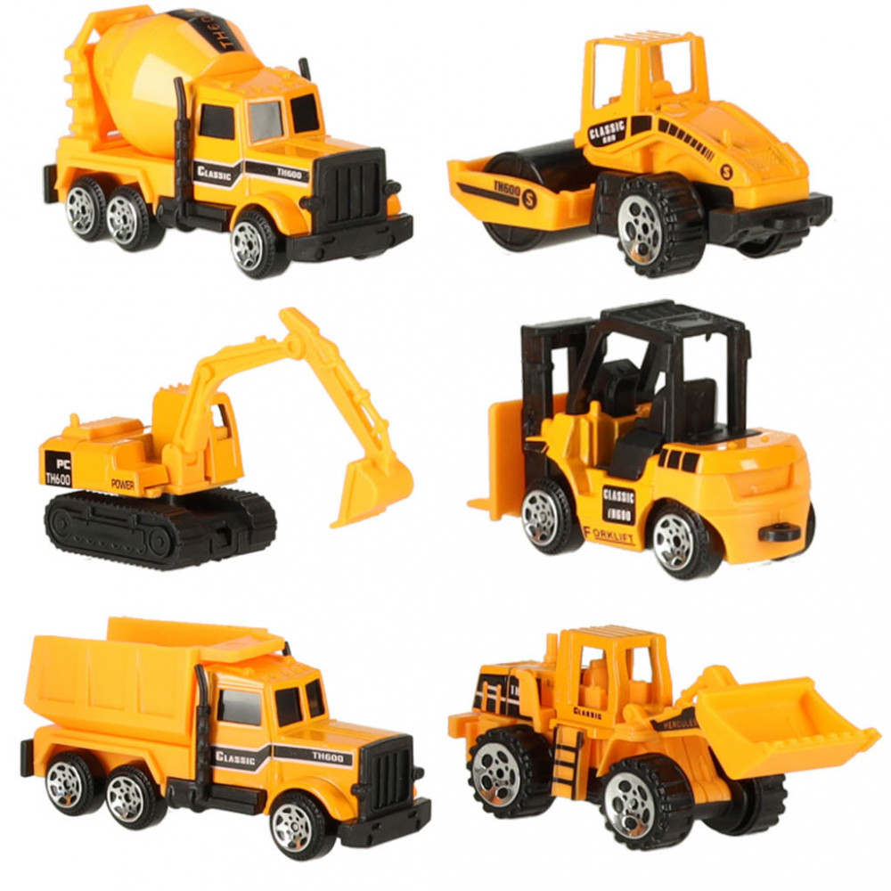 Hat darabból álló, tartós műanyagból készült építőipari árbocszett. A készlet tartalmaz egy betonkeverőt, egy targoncát, egy kotrógépet, egy buldózert, egy dömperkocsit és egy úthengert. A készlet fejleszti gyermeke kreativitását és fantáziáját. Méretek 7.5x2.5x3.5cm.