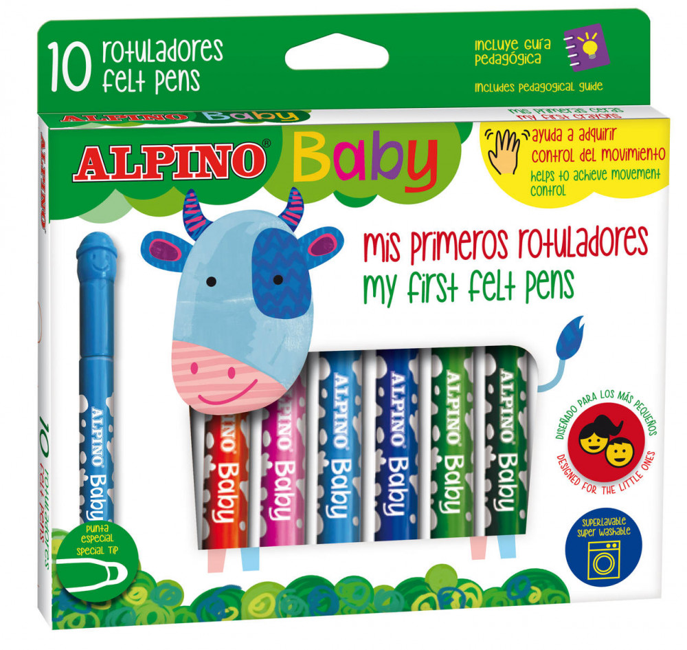 A csomag 10 színes filctollat tartalmaz. Az Alpino Baby termékcsalád ideális a kisgyermekek számára.
