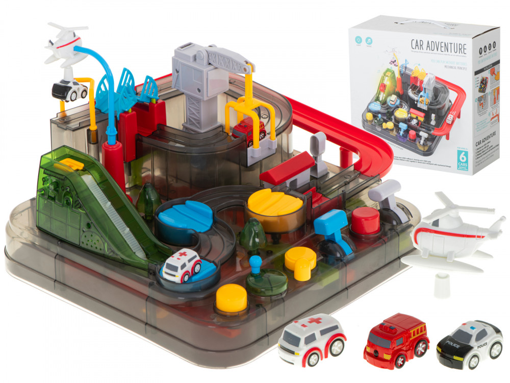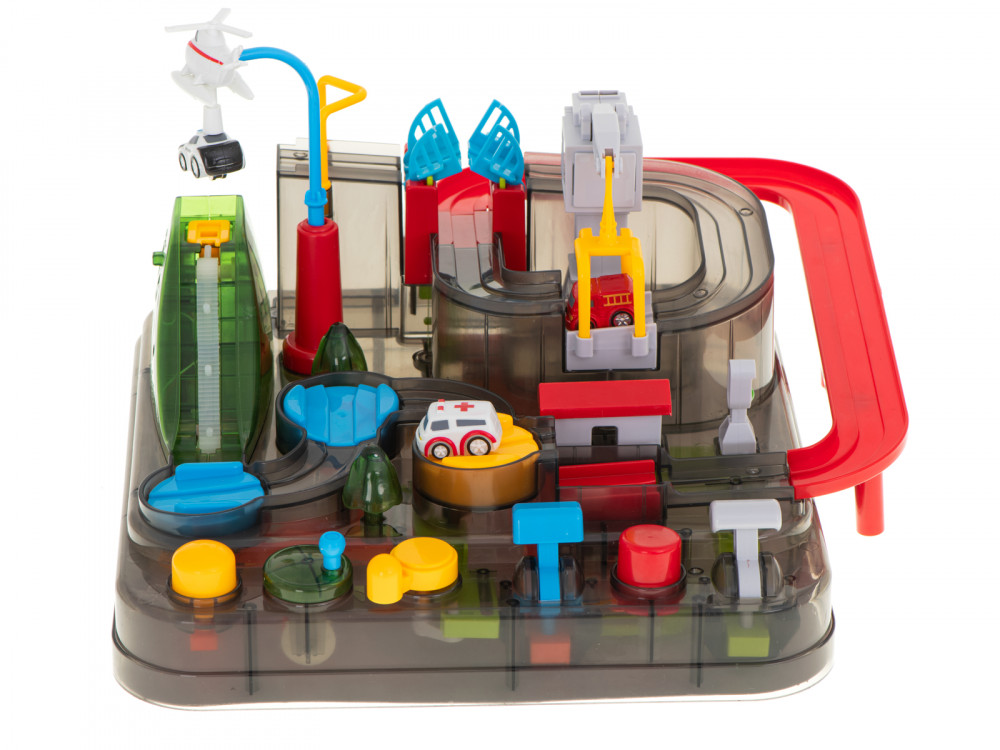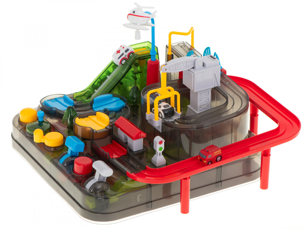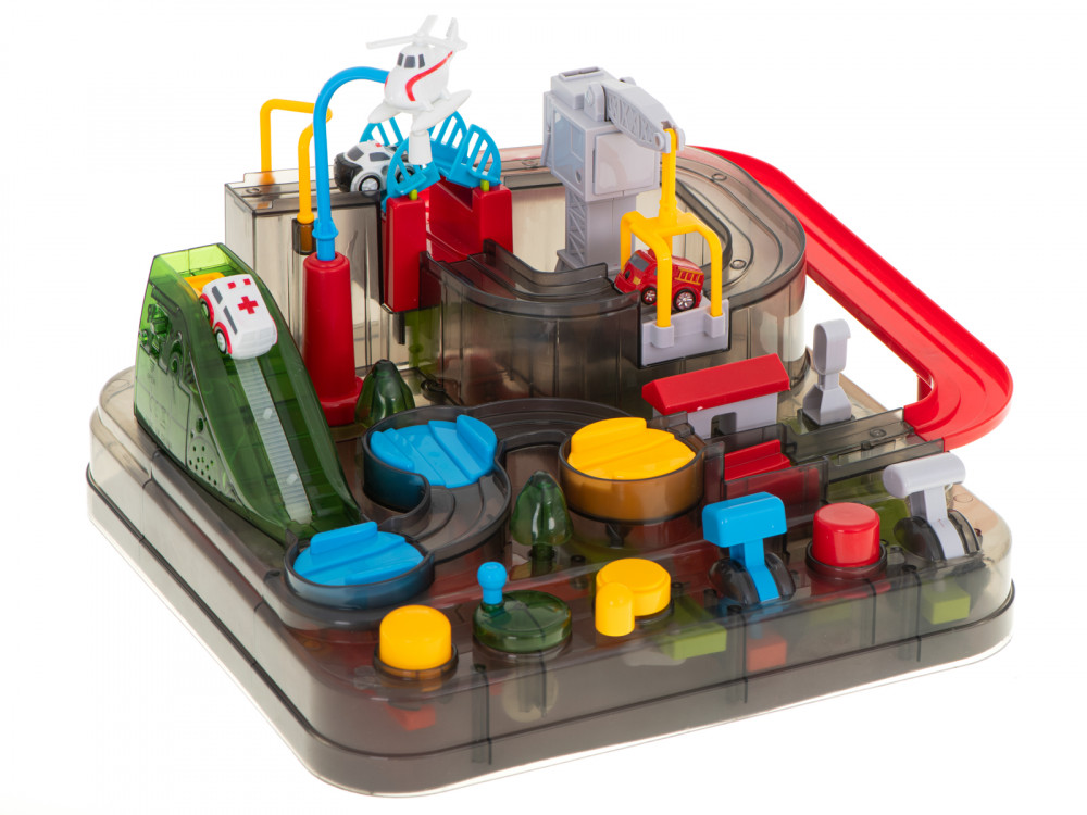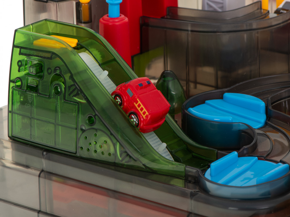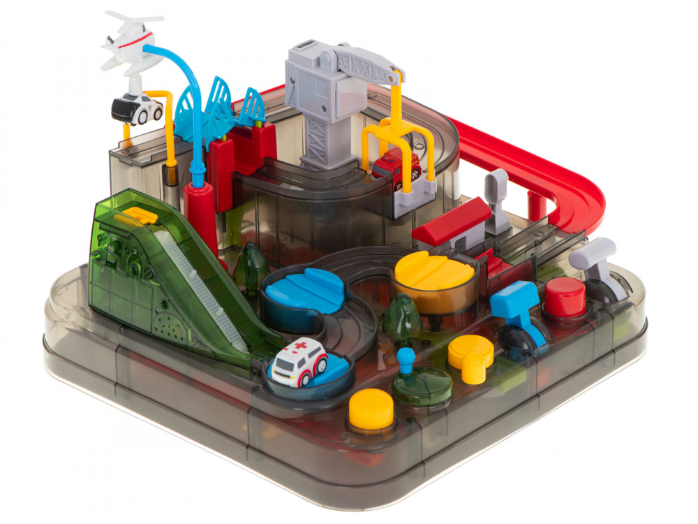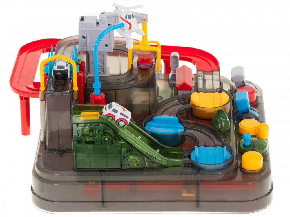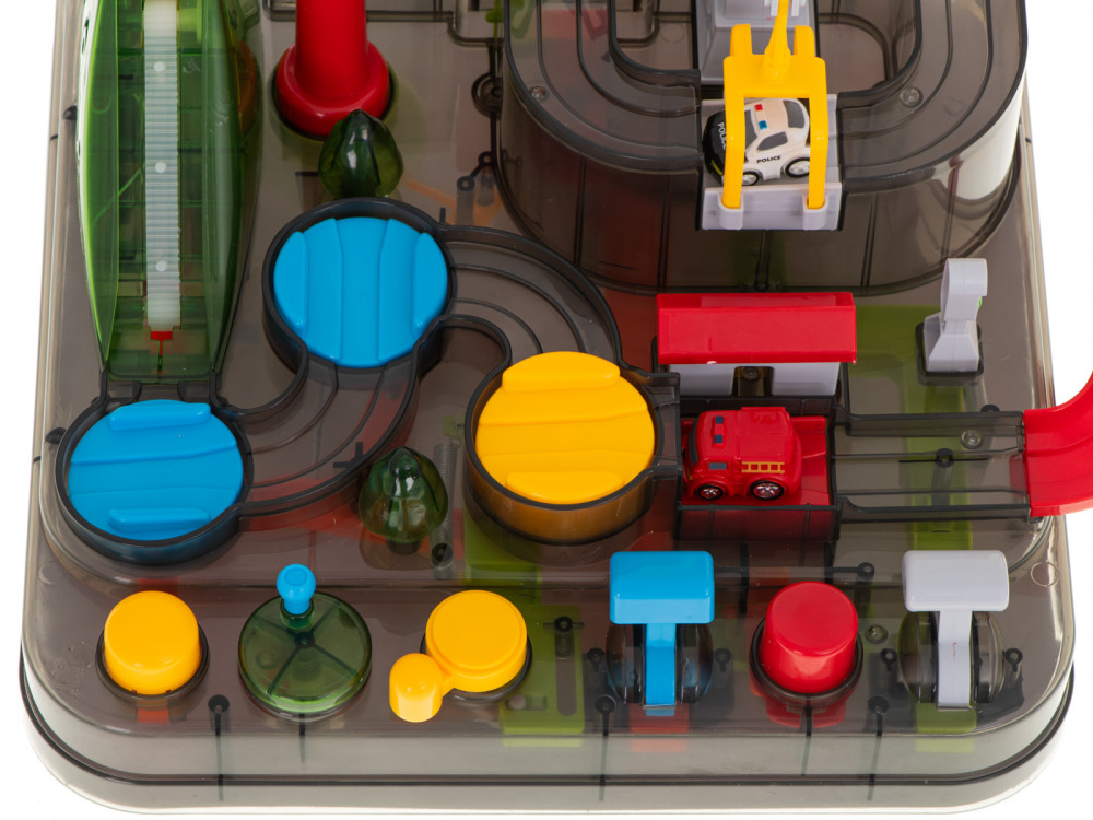 Többfunkciós autópálya. Ideális a kalandrajongók számára. A teljes pálya befejezéséhez a gombokat és a gombokat megfelelően kell működtetni. A játék fejleszti a kézügyességet és gyakorolja a logikus gondolkodást. Tartalmazza: pálya, 3 autó. A pálya méretei: 36x36x24.5cm.