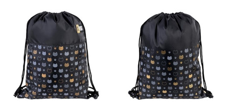 Fekete Bambino zsinóros táska. A macskás grafika sok kisgyereknek tetszeni fog. A zsákos hátizsák tökéletes a váltócipő vagy tornaruha bepakolásához. Méretek: 34 cm x 43 cm.