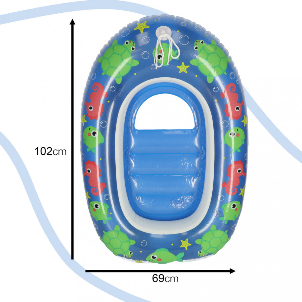 Szenzációs felfújható csónak gyerekeknek. Kényelmes pihenést és szórakozást biztosít a forró napokon. A csónak szélein csikóhalak és teknősök vannak nyomtatva. Tartalmazza: dingi, javítófolt, csomagolás. Szín: kék. Méretek: 102x69cm.