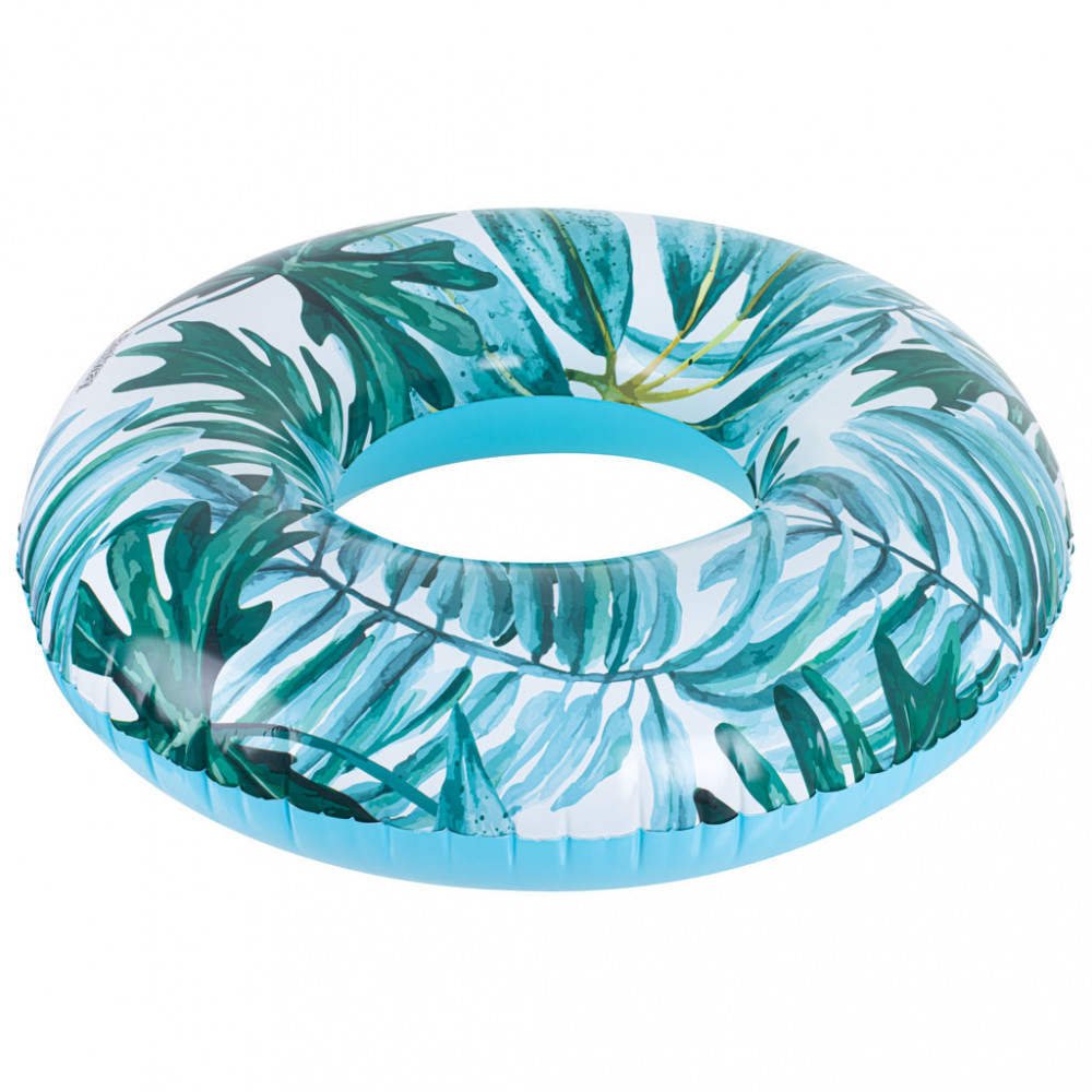 Egy fantasztikus úszó kerék. Tökéletes a vízparti pihenéshez egy forró napon. Modern, szemet gyönyörködtető - trópusi pálmafa- és levélmintával. Szín: kék. Max: 90 kg. Anyaga: PVC. Átmérő: 119 cm.