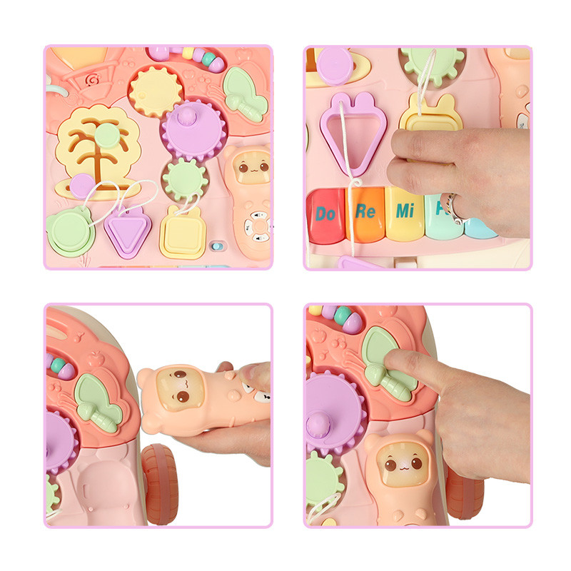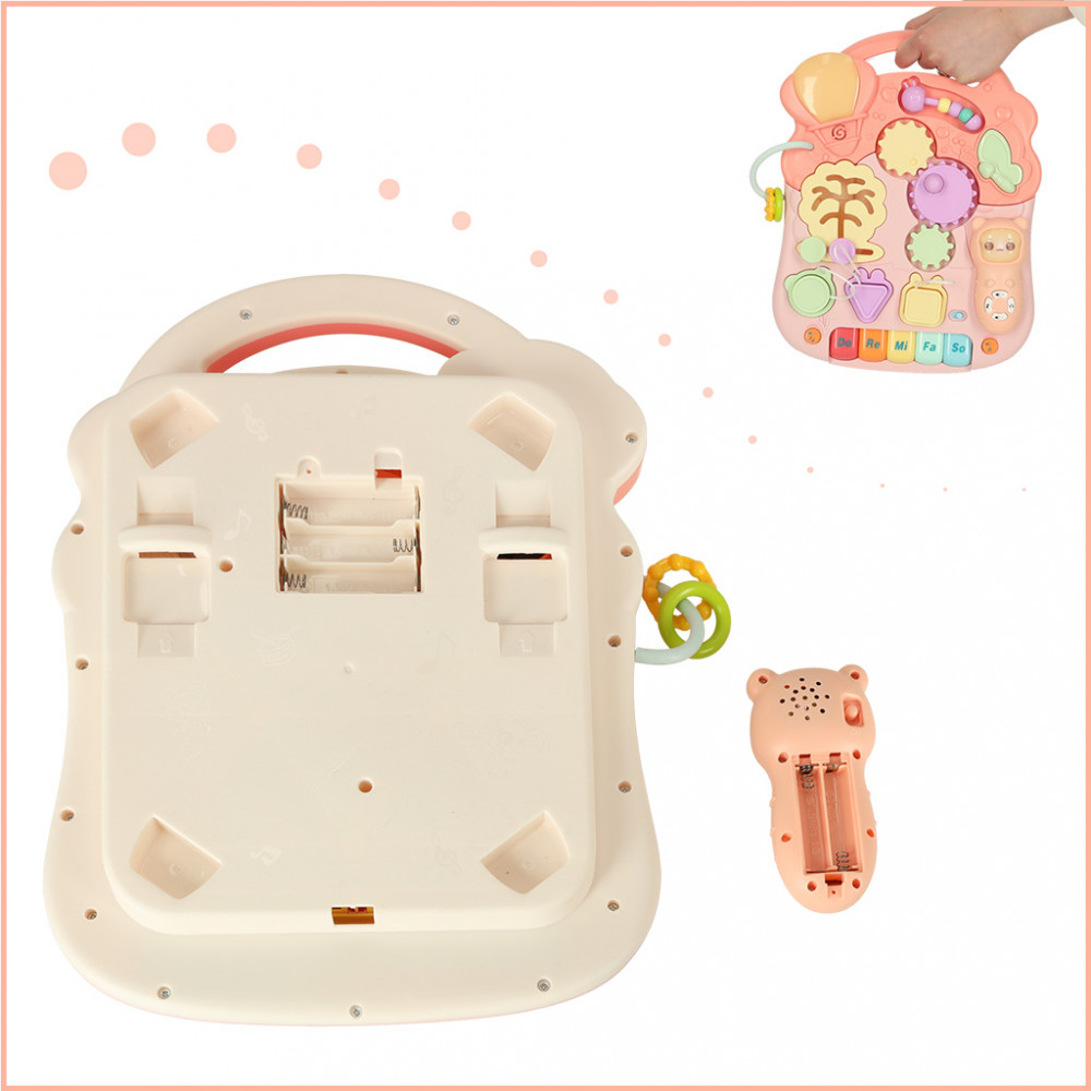 A tábla sok különböző, kisebb részből áll, hogy felkeltse a kisgyermek figyelmét, és játékra ösztönözze. A tábla elemei közé tartozik egy zongora, gyöngyök, műanyag fogaskerekek, egy labirintusfa, egy lámpa, ABC betűkkel ellátott formák és egy kivehető telefon zenével.