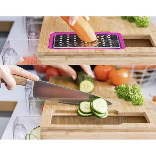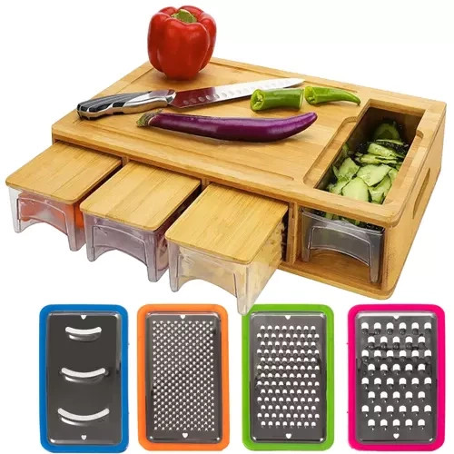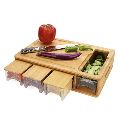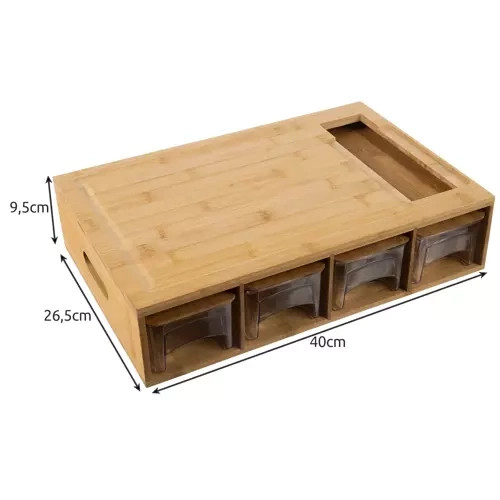 Bambusz vágódeszka, 4 reszelővel + 4 rekesszel