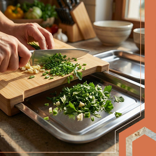 A vágódeszka és a tárolóedények kombinációja különösen hasznos kisebb konyhákban, ahol fontos a munkafelület okos kihasználása. Az edények a deszka alatt kapnak helyet, így használaton kívül sem foglalnak külön teret a pulton.