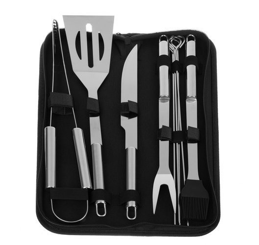 • LEÍRÁS - anyaga: rozsdamentes acél, mennyiség: 9, a készlet tartalma: kés, villa, spatula, kefe, fogó, 4 penge, tok; méretek: 38,5 / 12 / 5cm; súlya: 0,8 kg