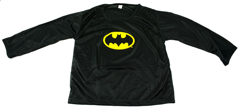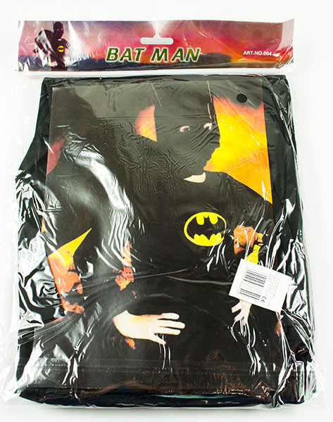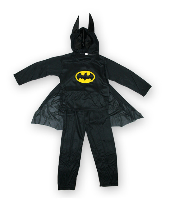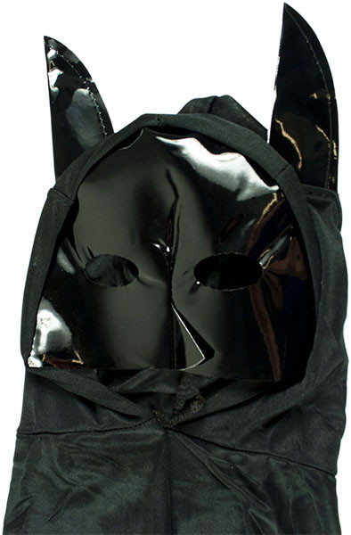 Háromrészes Batman jelmez gyerekeknek poliészterből. Nadrág: derék-19-25cm, hossza 67cm; blúz: váll-35cm, hossza-42cm, ujja-37cm; köpeny hossza: 48 cm.