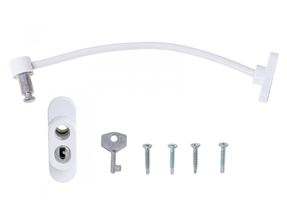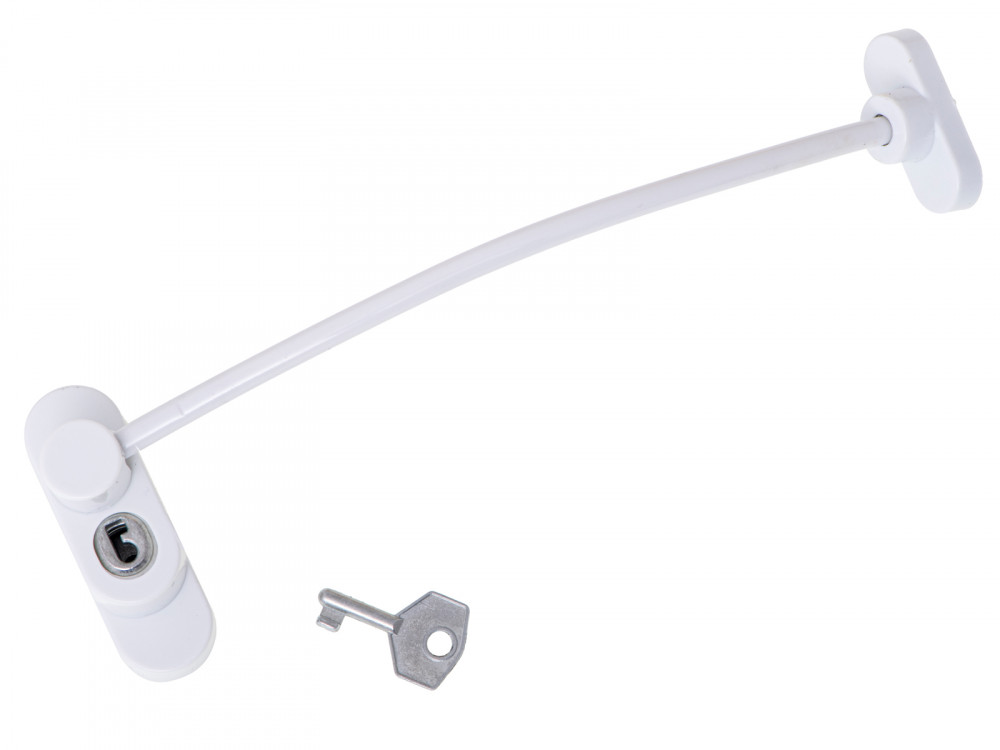 Praktikus, zárható biztonsági eszköz, amely megakadályozza az ablak szélesebbre nyithatóságát. Elengedhetetlen termék egy olyan otthonban, ahol kisgyermekek vannak. Könnyen telepíthető. Zár, kulcs és csavarok tartozék. Anyag: fém és műanyag. Szín: fehér. Hossza: 21cm.