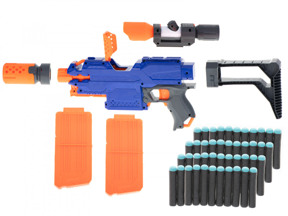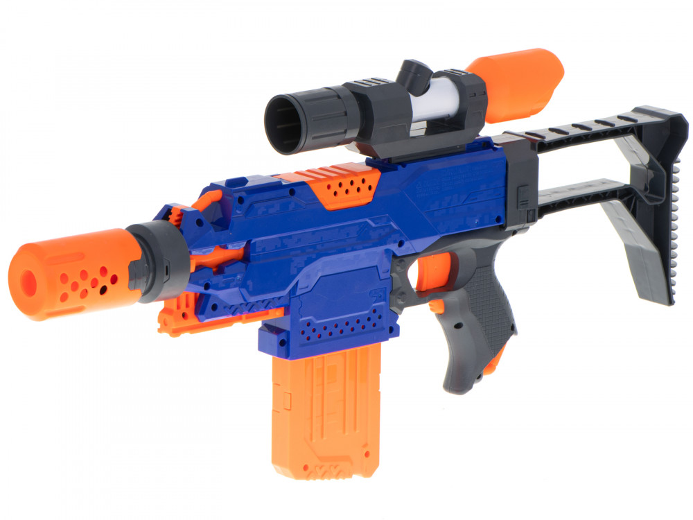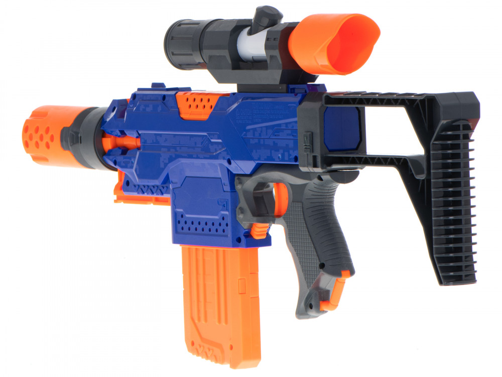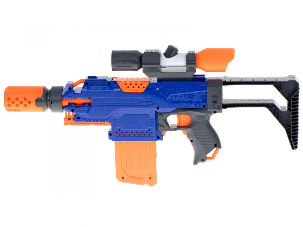 A fantasztikus Blaze Storm gépfegyver. A tökéletes fegyver a kis katona számára. Elősegíti a motoros koordinációt. Tartalmazza: puska, 48 nyílvessző, tár, levehető irányzék. Tápegység: 4x AA 1,5V-os elem (nem tartozék). A puska méretei: 34x22x5cm.