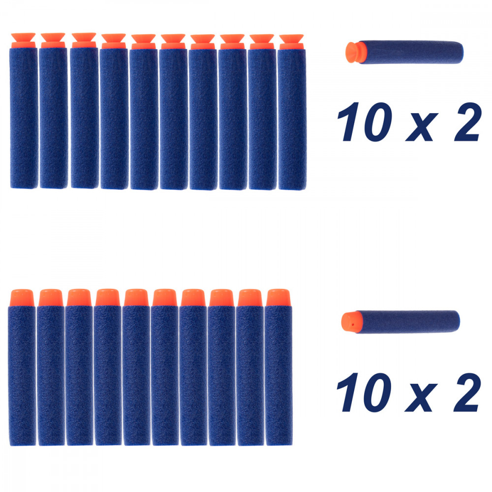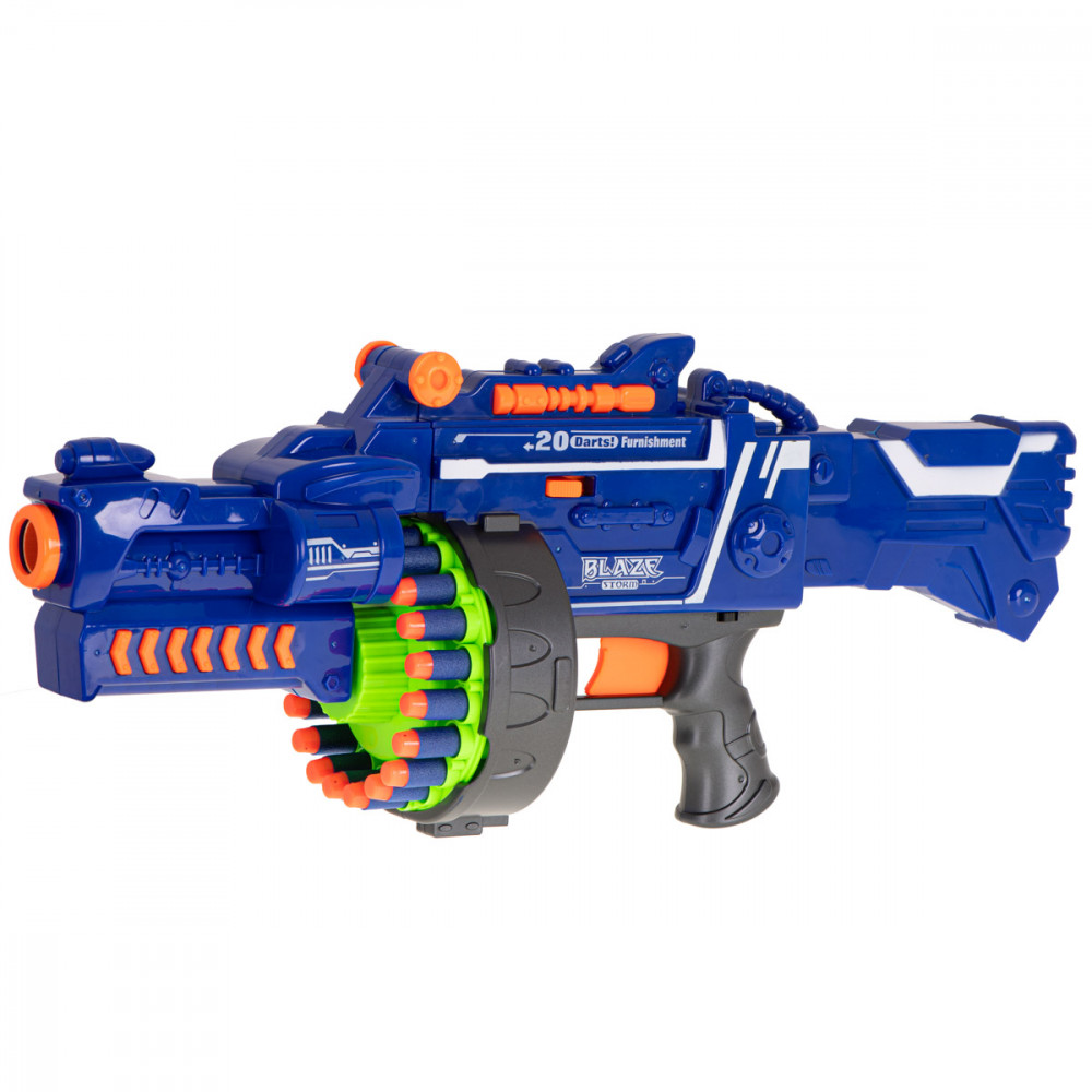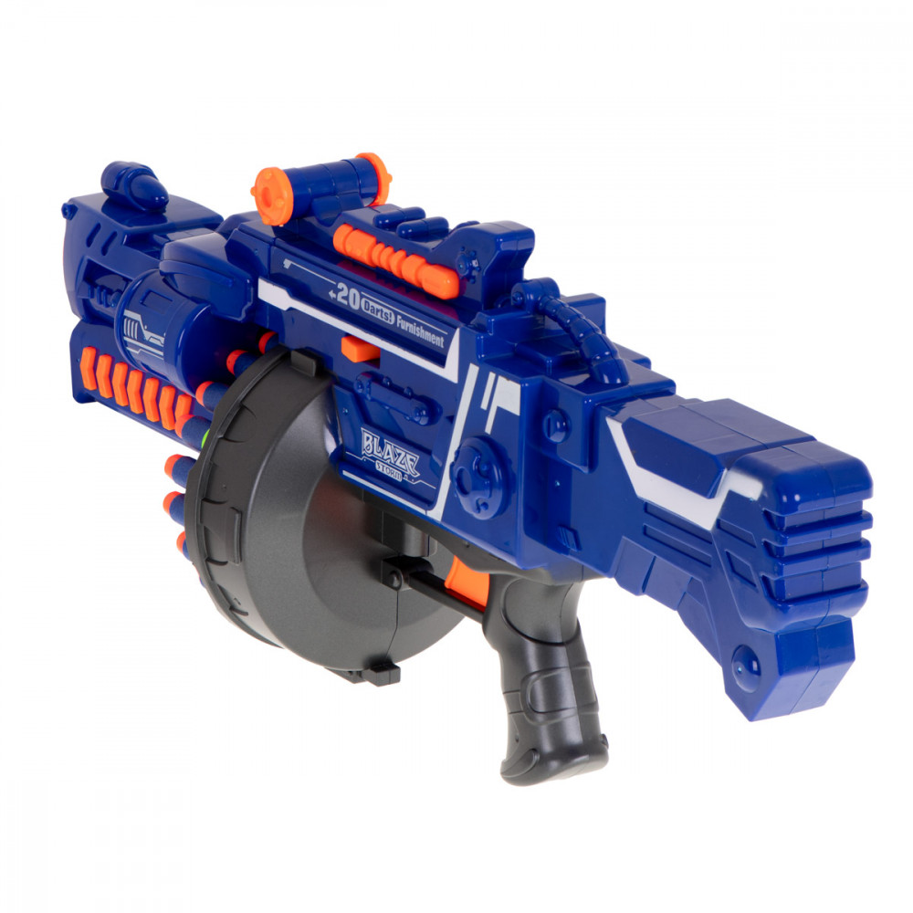 Szenzációs nagyméretű dobópuska műanyagból, élénk színekben. A készlet tartalmaz puskát, 20 tapadókorongos nyilat, 20 hagyományos nyilat. A puska 5 darab AA 1,5 V-os elemmel működik (nem tartozék). Lőtávolság kb. 10m. Méretek 53x15x23cm.