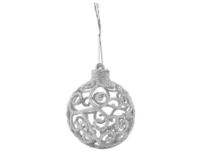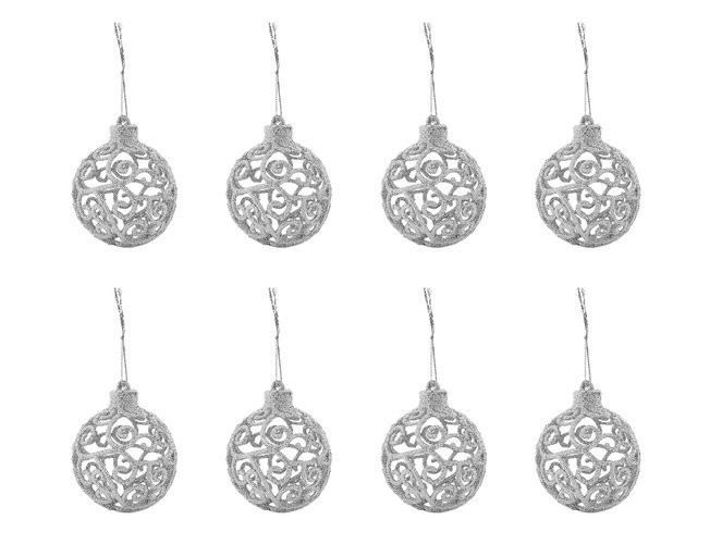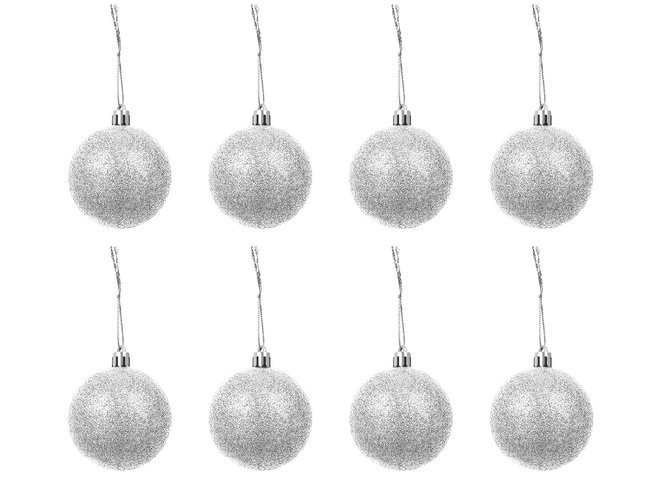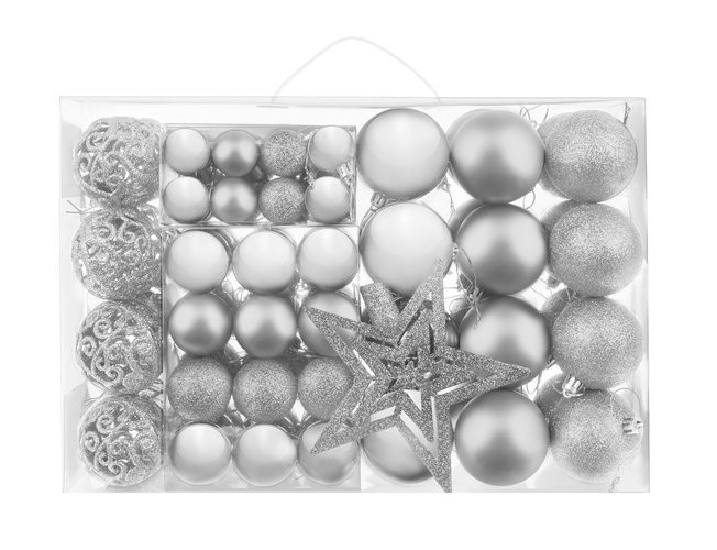 • MŰSZAKI ADATOK - szín: ezüst; anyaga: műanyag; darabszám a készletben: 100 + csillag; csecsebecsék típusai: matt, csillogó, fényes, áttört; csecsebecse átmérők: 6/4/3 cm; csillagméretek (hosszúság / szélesség): 12/14 cm; súly: 0,7 kg; súly a csomagban: 0,9 kg.