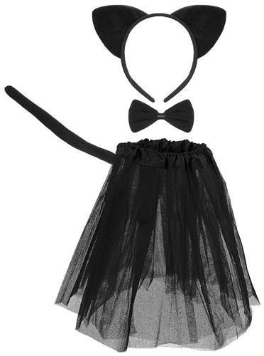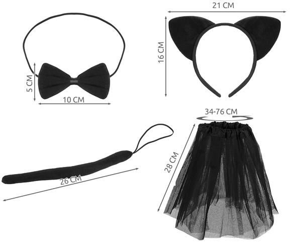 • LEÍRÁS - fekete szín; csokornyakkendő méretei (szélesség/magasság): 10/5cm; fejpánt méretei (szélesség/magasság): 21/16cm; farok hossza: 26 cm; szoknya méretei (körméret/magasság): 34-76/28cm; készlet súlya: 60g.