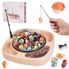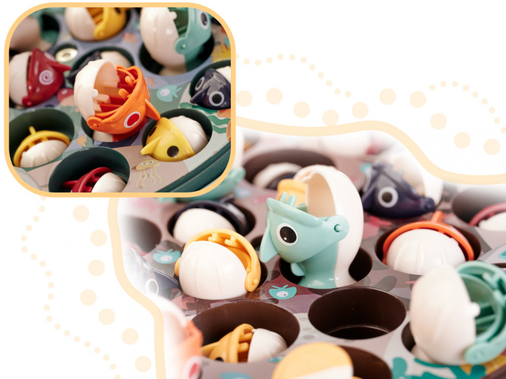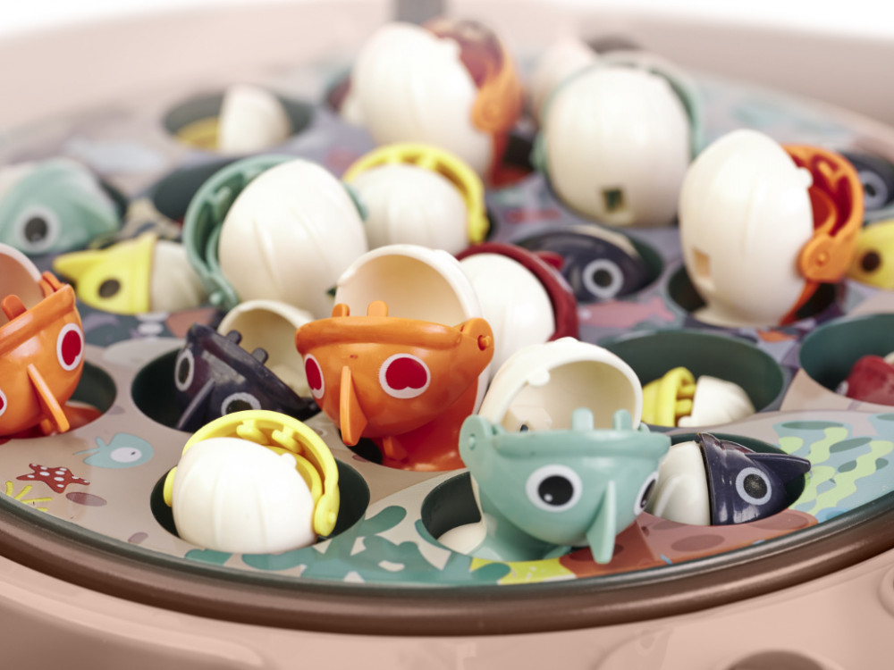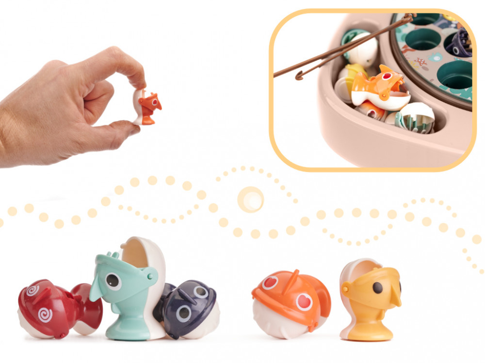 Vegye a horgászbotokat a kezébe, és lásson munkához! A tábla középső része forog, és ezzel mozgásba hozza a halakat, amelyek kinyitják a szájukat.