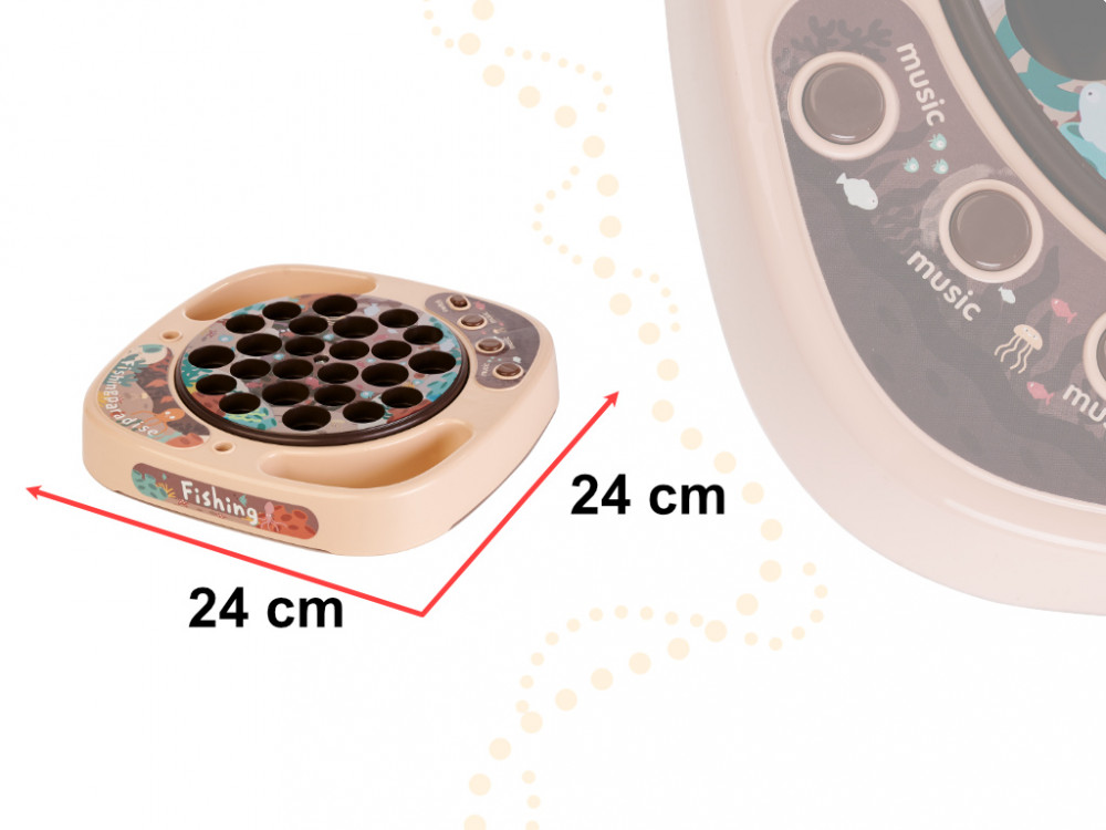 Egy nagyszerű családi horgászjáték. A kis horgászoknak is tetszeni fog. Egyszerűen helyezze a piacokat a lyukakba, vegye a horgászbotokat a kezébe, és kezdjen el játszani. Tápegység: 3 x AA (nem tartozék). Rúd hossza: 17 cm. Alapméretek: 24x24x4.5cm.