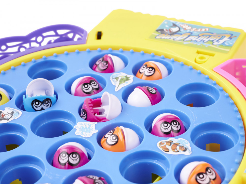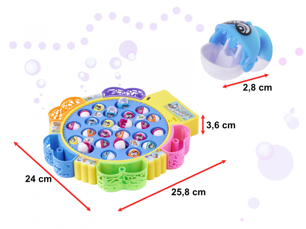 Fantasztikus játék az egész család számára a halászattal kapcsolatban. Tápegység: 2 db AA 1,5 V-os elem (nem tartozék), Alapok: 25.5cm x 23.5cm x 3.5cm, Hal: 3cm x 2cm
