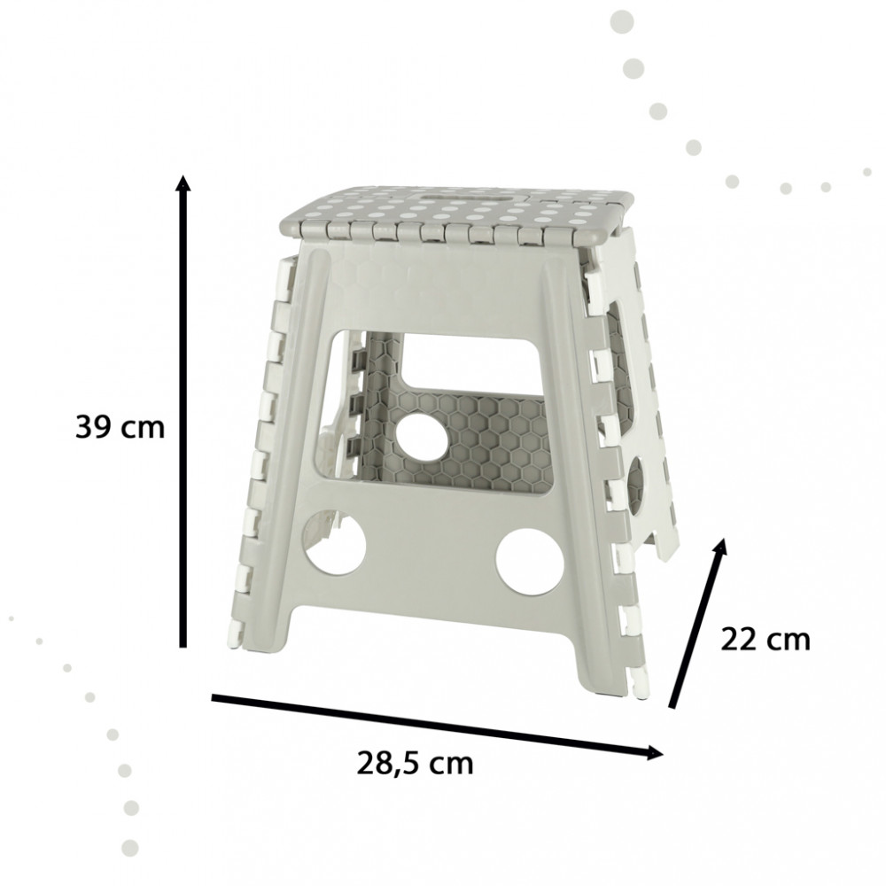 Összecsukható zsámoly - minden otthonban nélkülözhetetlen. Segítségével a legmagasabb szekrények elérése többé nem jelent problémát. A csúszásmentes anyag gondoskodik a biztonságról. Anyaga: műanyag. Magasság: 39 cm.