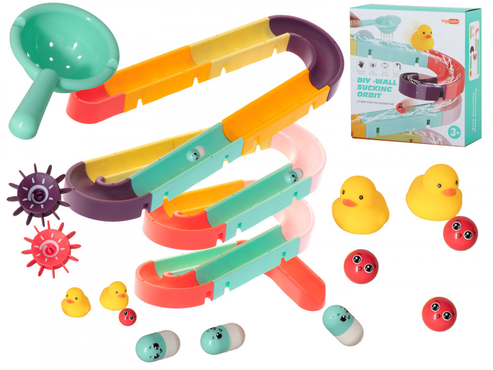 Kreatív pálya szett csúszdával. Ideális minden kisgyermek számára, akivel fürdés közben játszhatnak. A készlet a következőket tartalmazza: alkatrészek a pálya építéséhez, gumikacsák, golyók, babok és egy szűrő. Anyag: műanyag. A mintasáv méretei: 40x40x12cm. A kacsa méretei: 6x4,5x5cm.