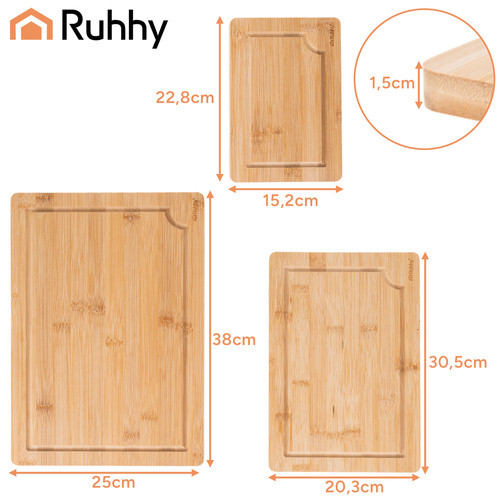 Ruhhy bambusz vágódeszka szett tartóval, 3 darabos készlet