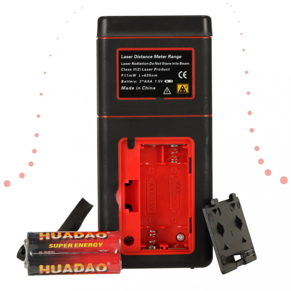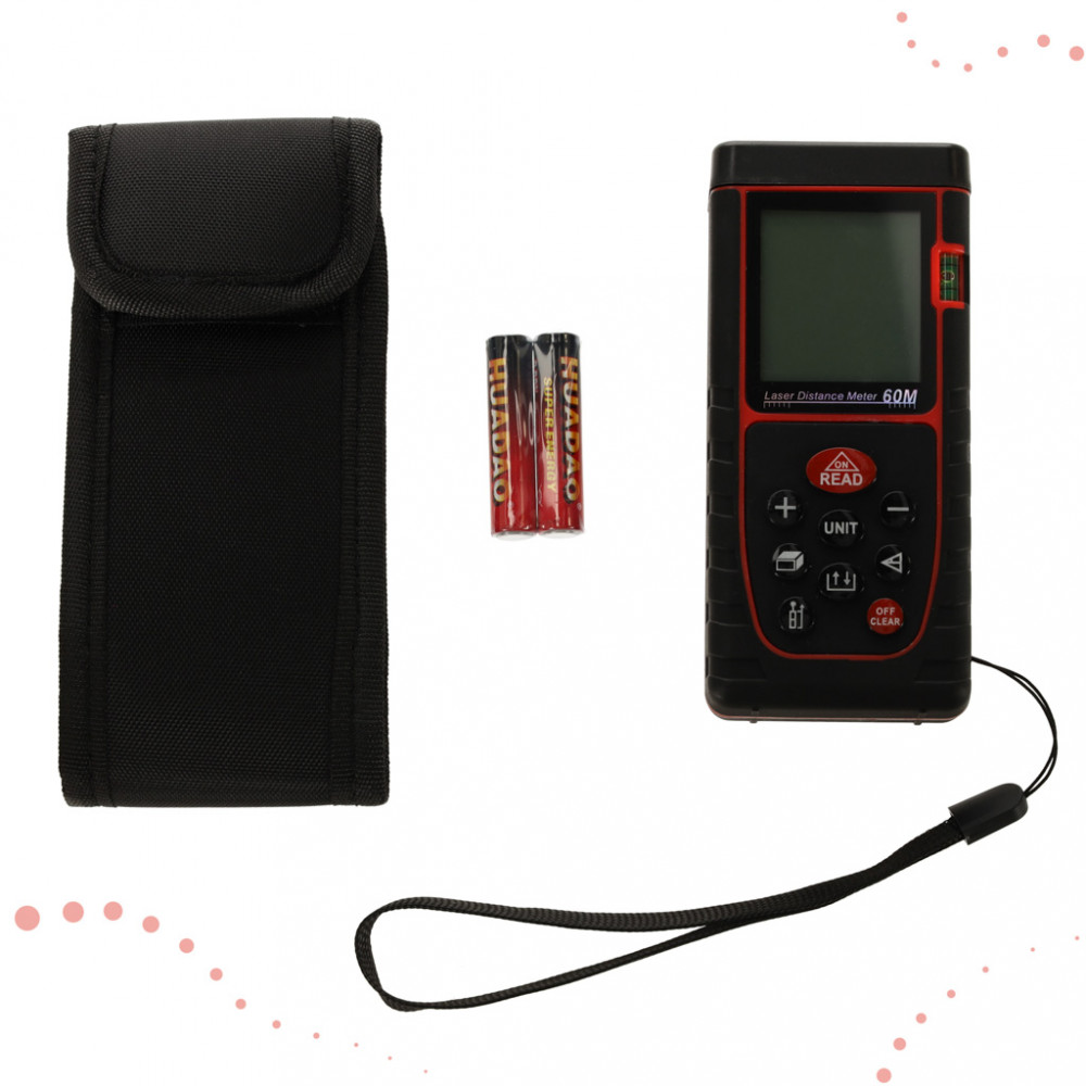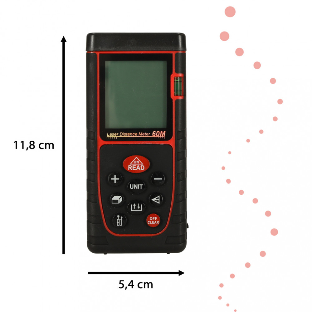 Lézeres távolságmérő 60 méteres mérési tartományban, 3 milliméteres pontossággal. A mérés 0,4 másodperc alatt történik. Funkciók: hossz, terület, térfogat, Pitagorasz, összeadás és kivonás mérése. Energiaellátás: AAA elemek. Méretek: 118x54x27 mm.