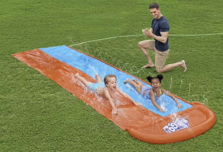 KÉTSÁVOS VÍZICSÚSZDA H2O GO! – Ez a csúszda a nyári szabadtéri játékok egyértelmű kedvence. Kétsávos pályával rendelkezik, amelynek hossza 488 cm, és locsolórendszerrel van ellátva, amelyhez kerti tömlőt lehet csatlakoztatni.