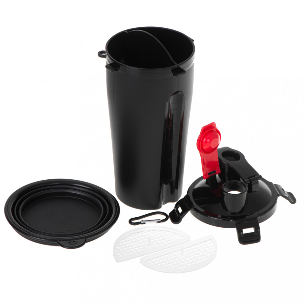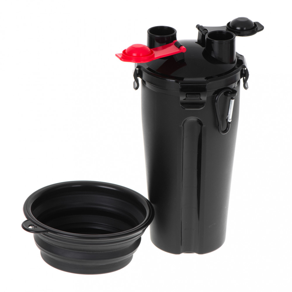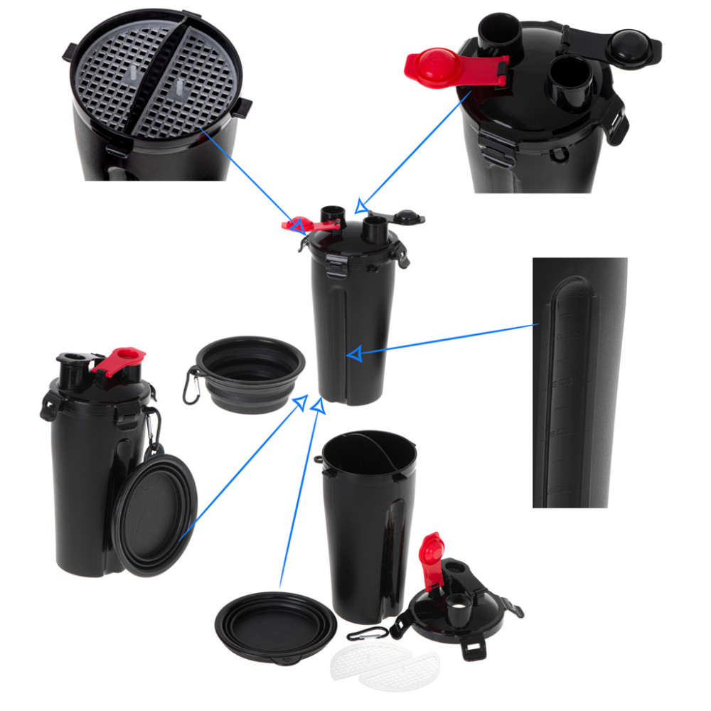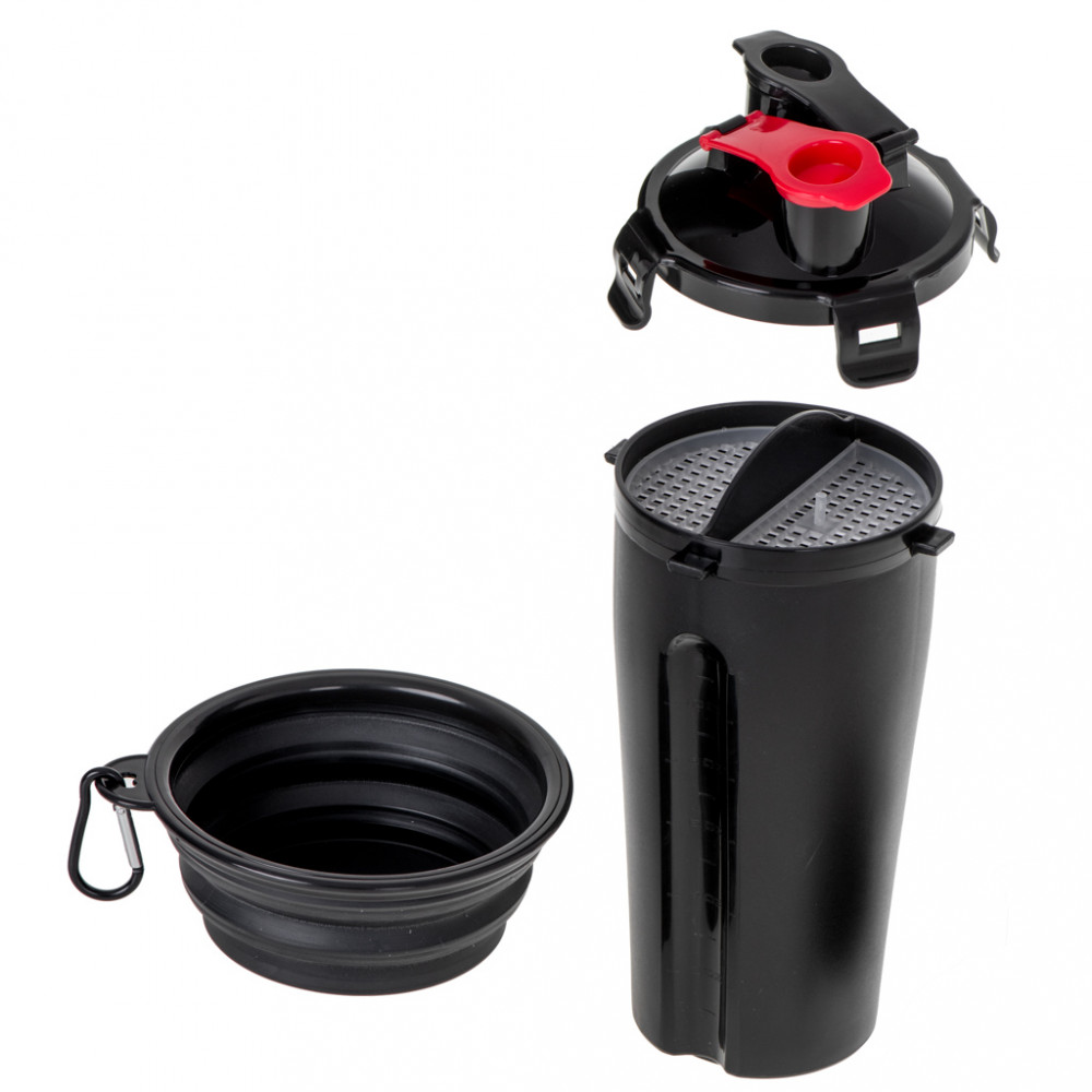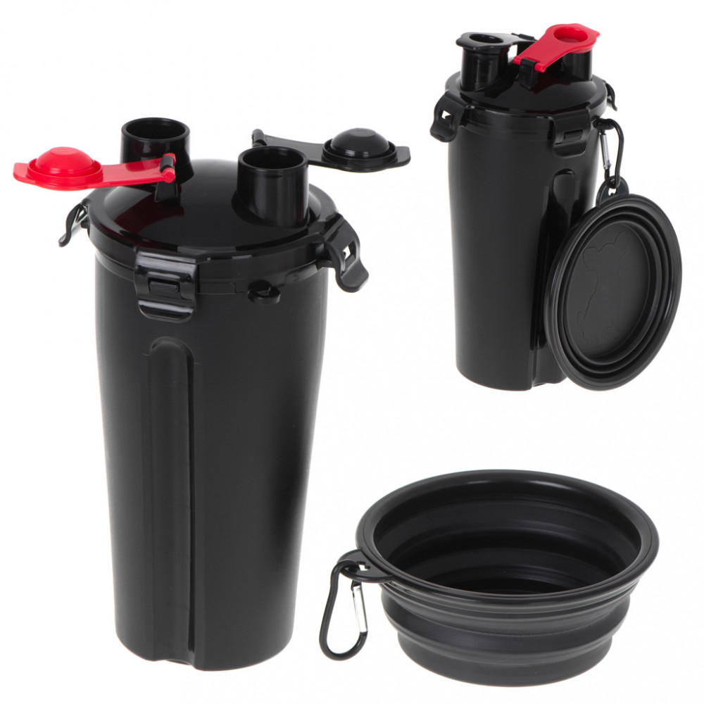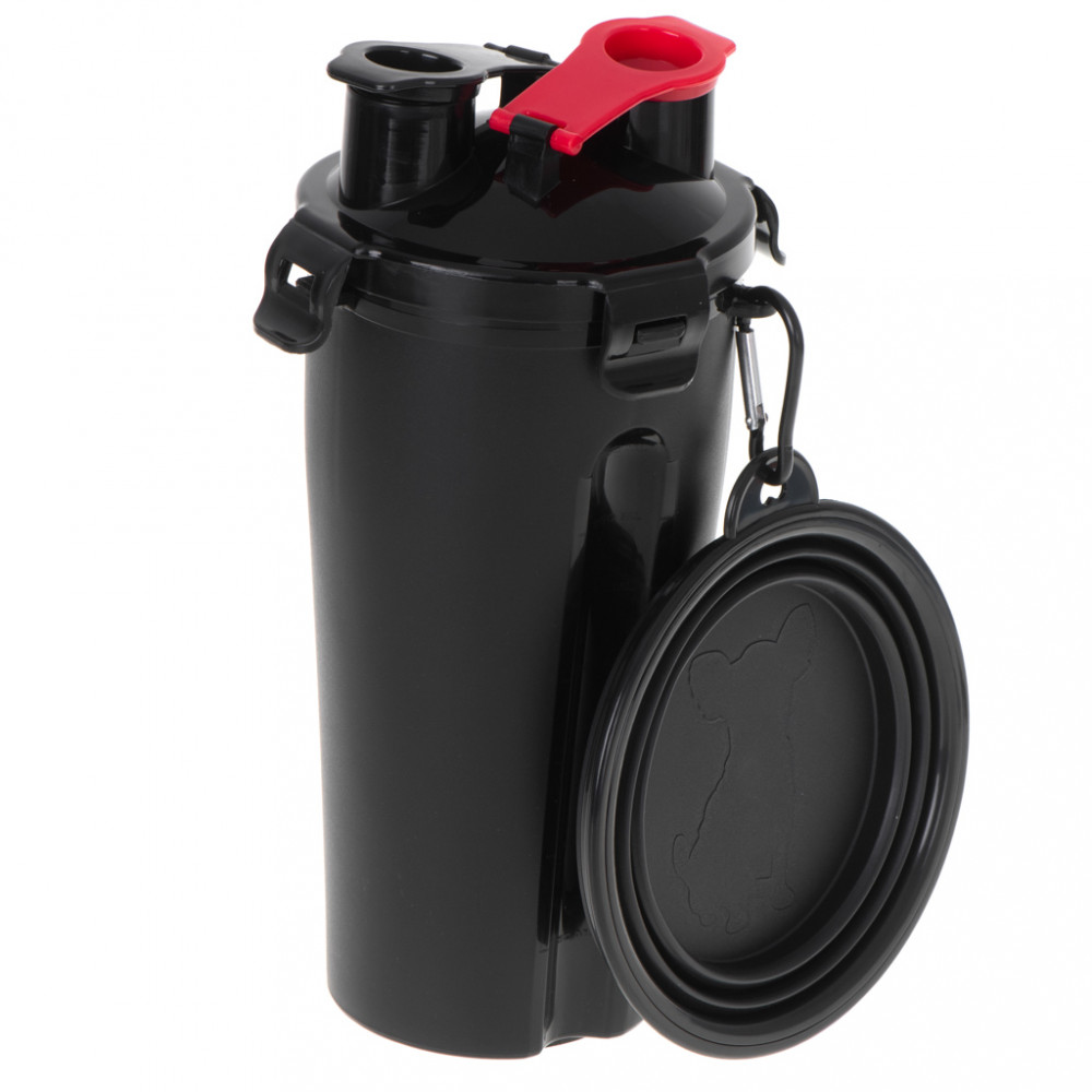 Praktikus palack két rekesszel a víz és a száraz állateledel számára. Tartalmaz egy összecsukható tálat is, amely a palackhoz rögzíthető. Anyag: műanyag. A csésze méretei: 22.5cm x 11.2cm. A kibontott tál méretei: 13cm x 1.9cm.