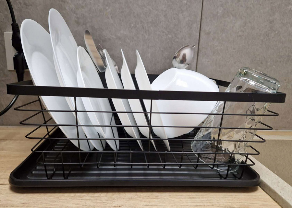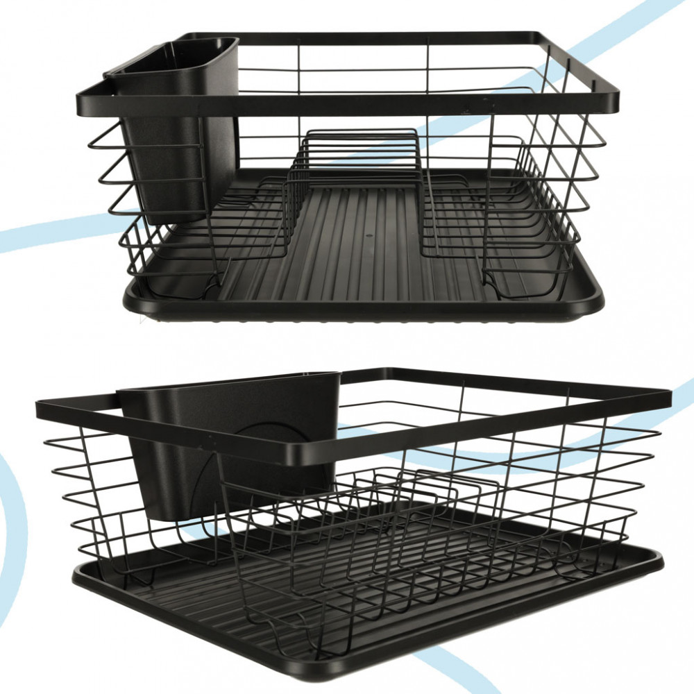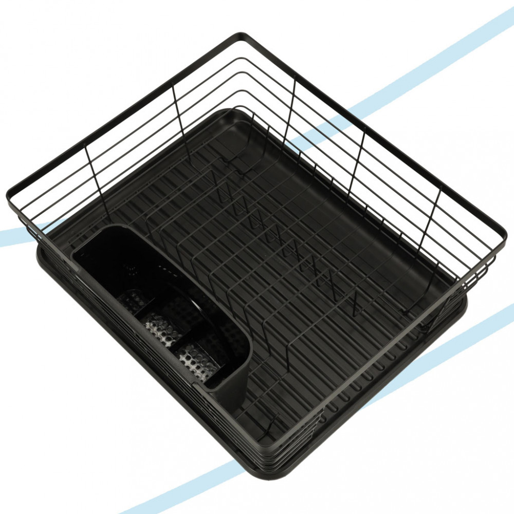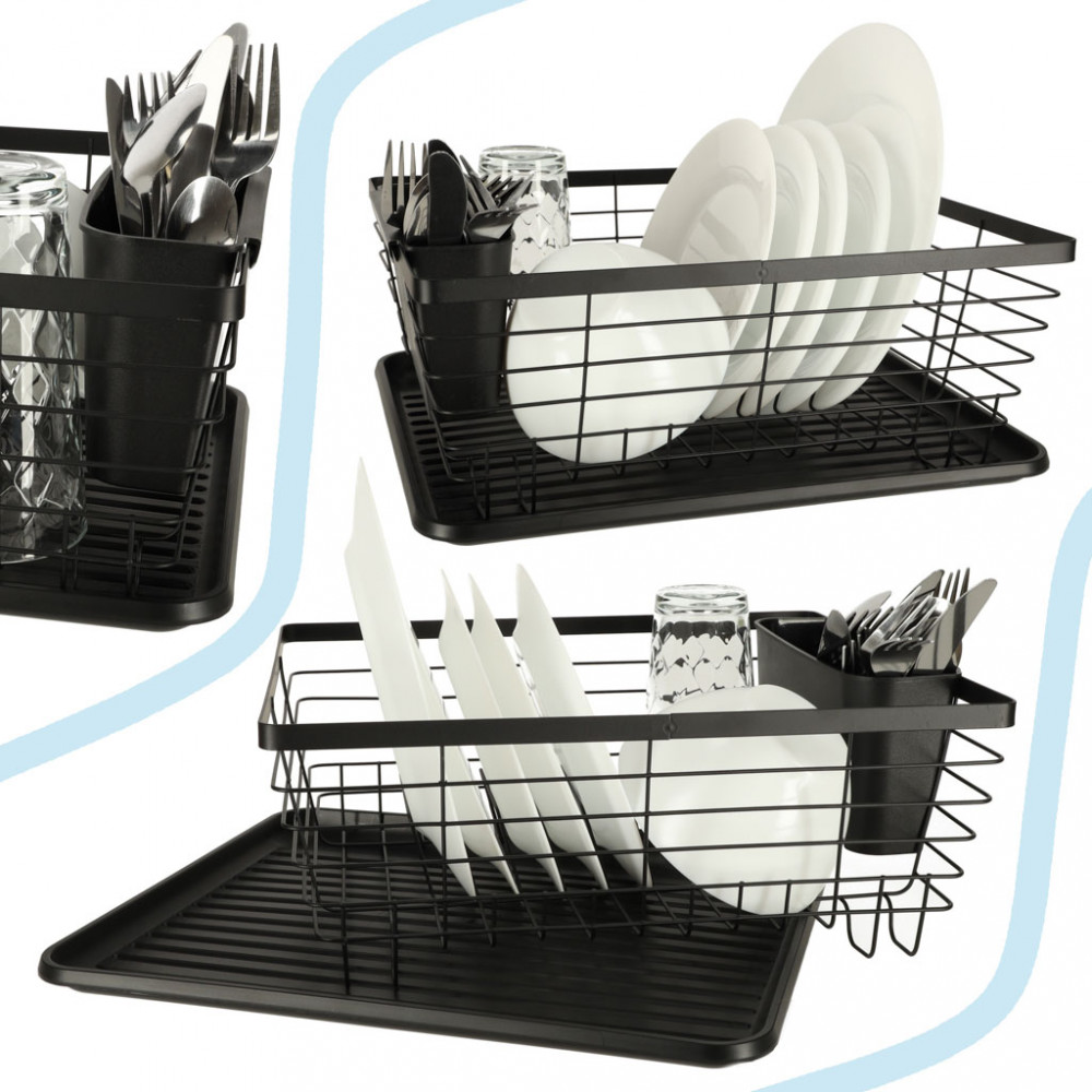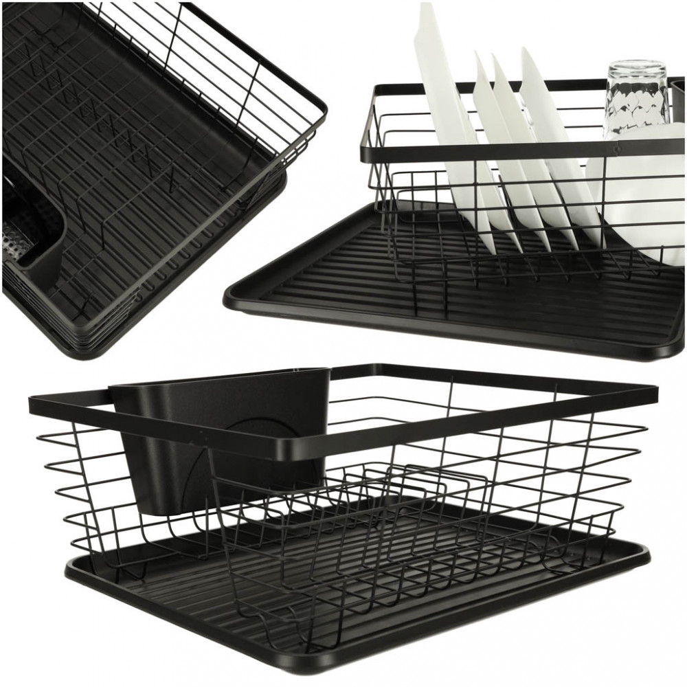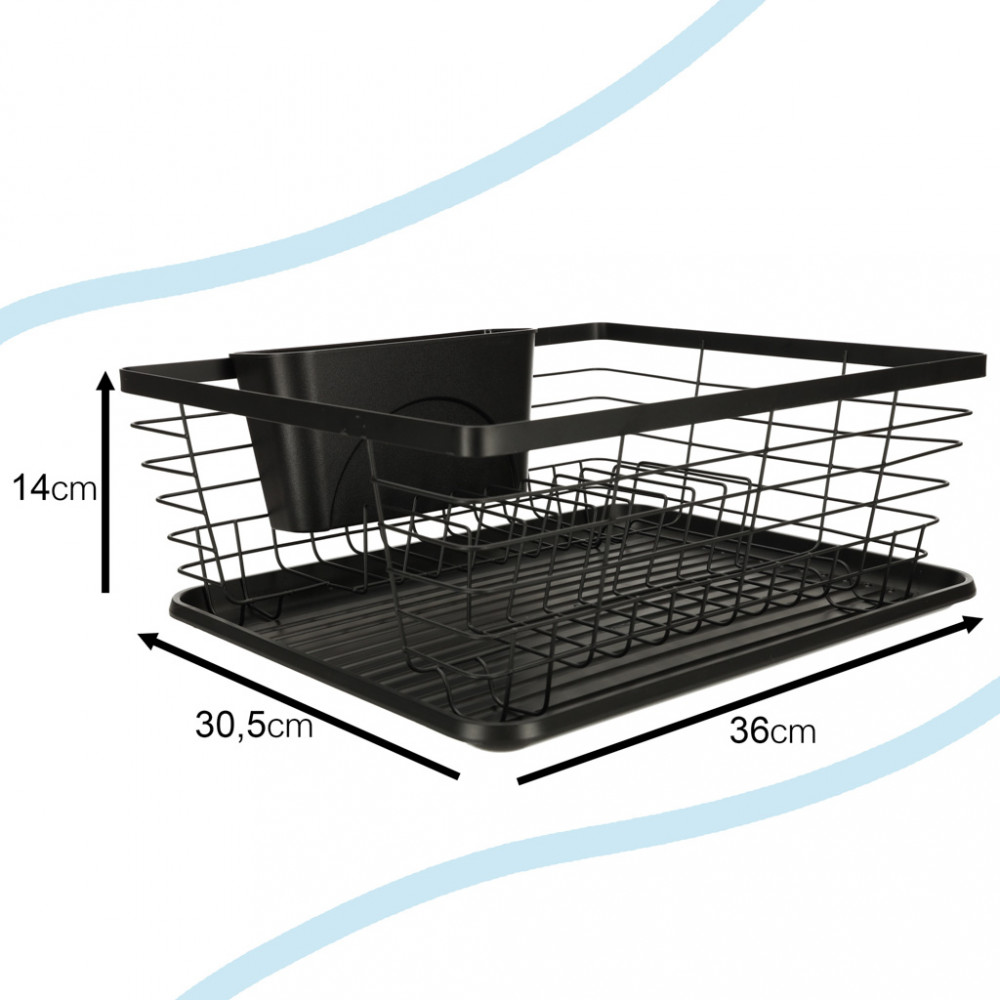 A konyhapulton elhelyezendő edénytálcát. Evőeszköz-tartállyal is rendelkezik. Alatta műanyag tálca a lecsöpögő víz összegyűjtésére. Szín: fekete. Anyaga: fém, műanyag. Méretek: 36 cm x 30,5 cm x 14 cm.