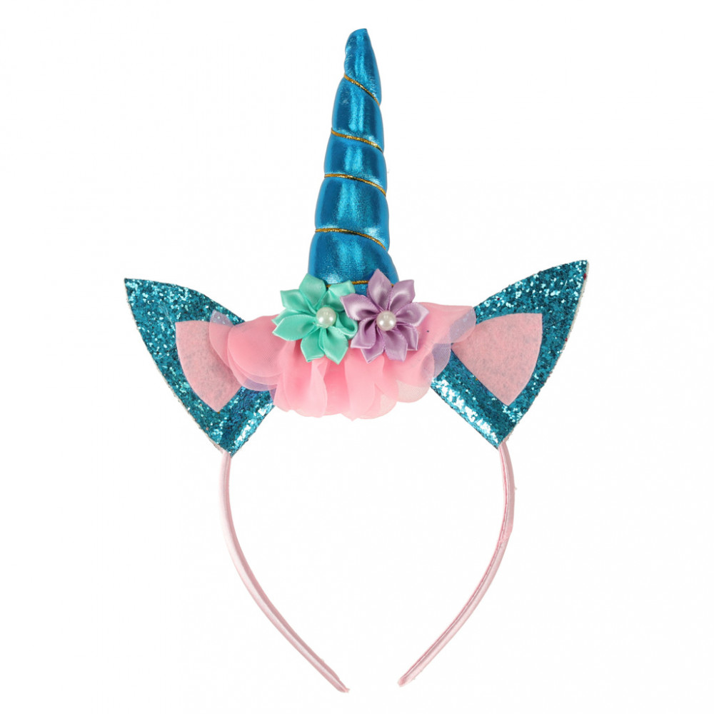 A műanyag fejpántot rózsaszín fényes anyaggal szegélyezik, és puha műanyag szarvval és flitteres fülekkel díszítik..