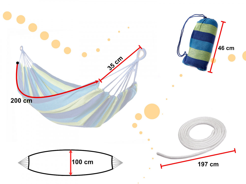 Egyszemélyes fonott függőágy rögzítőkészlettel. Erős kötelekkel és fémbetétekkel megerősített hurkokkal rendelkezik. Tartalmazza: függőágy, 2 kötél, 2 kampó. Táskába csomagolva. Maximális terhelés: 200 kg-ig. Szín: kékeszöld. Méretek: 200x100cm.