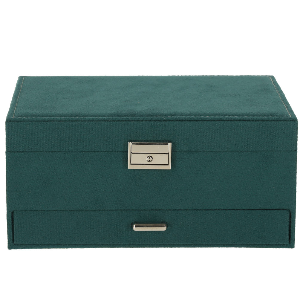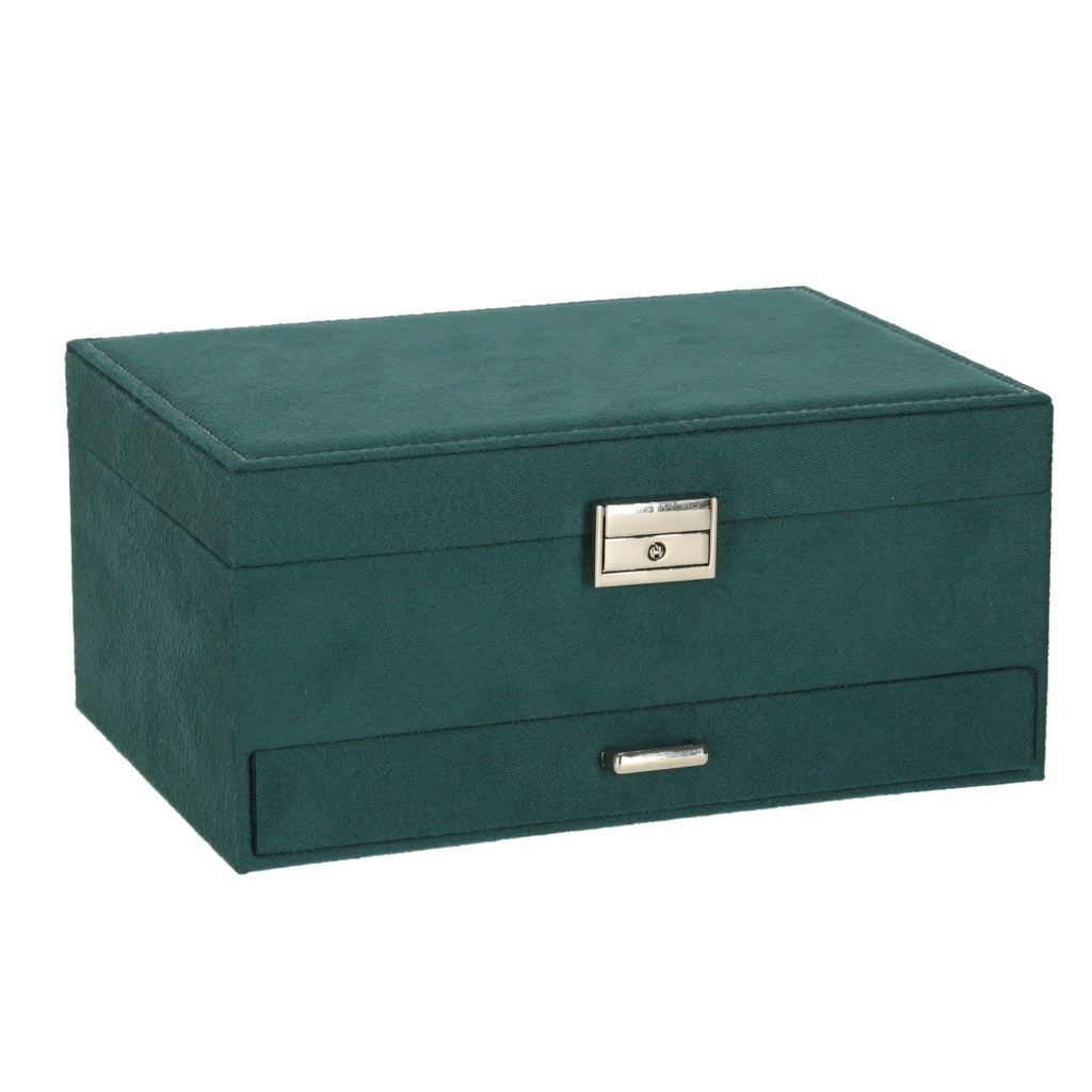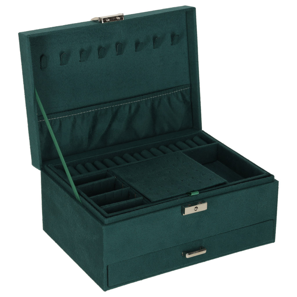 Zöld ékszerdoboz fiókkal és levehető felső polccal. A rekeszek, kampók és perforációk segítenek a kiegészítők átfogó elrendezésében. Méretek: 24 cm x 11 cm x 17 cm, szín: zöld.