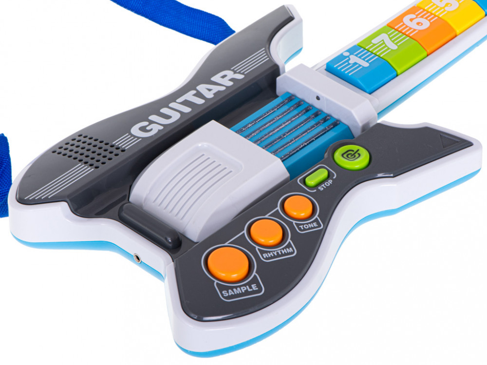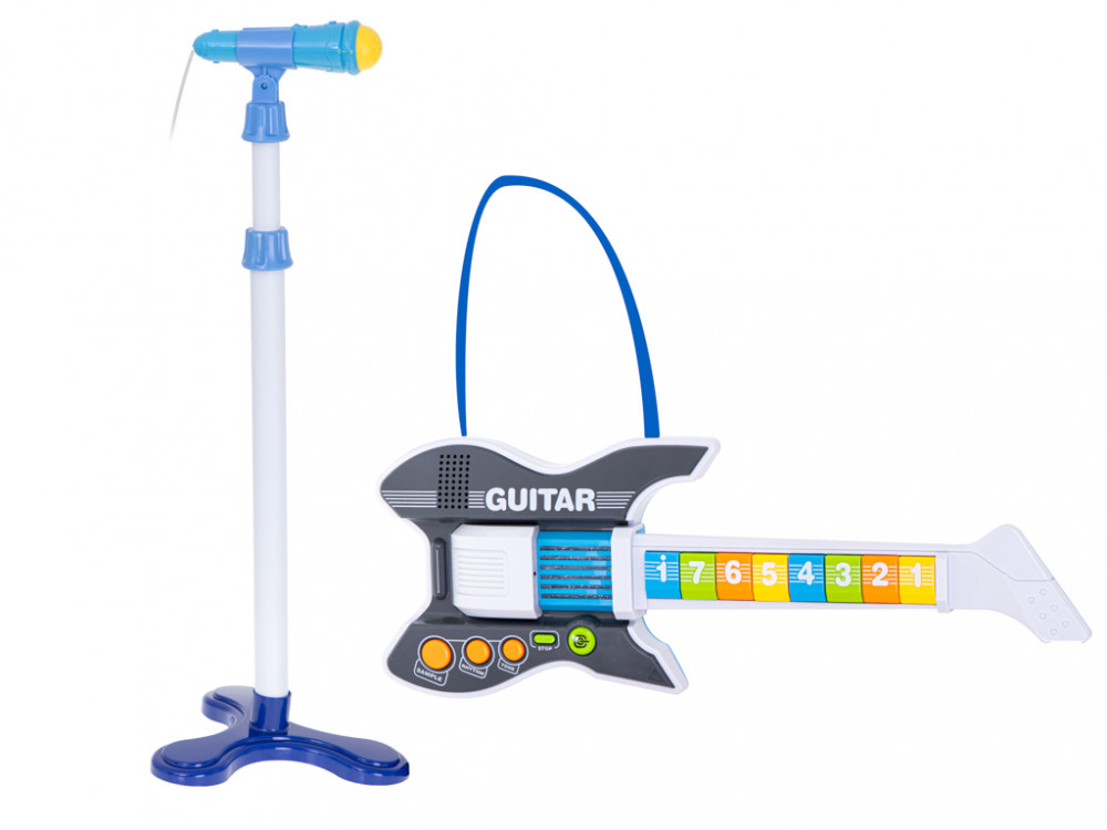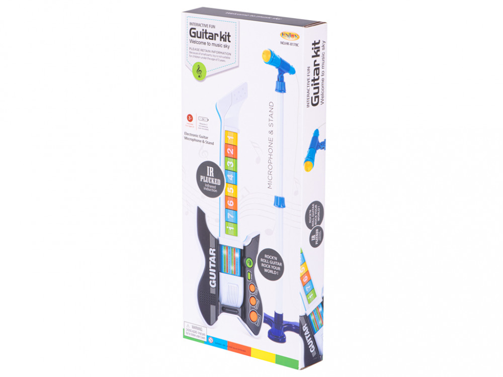 Nagyszerű rock gitár mikrofonnal. Ideális ajándék minden kis zenésznek. A játék pozitívan befolyásolja a gyermek koordinációját és ritmusérzékét. Anyag: műanyag. Szín: kék. Energiaellátás: 3x AA elem (nem tartozék). A gitár méretei: 53.5x20x4cm.