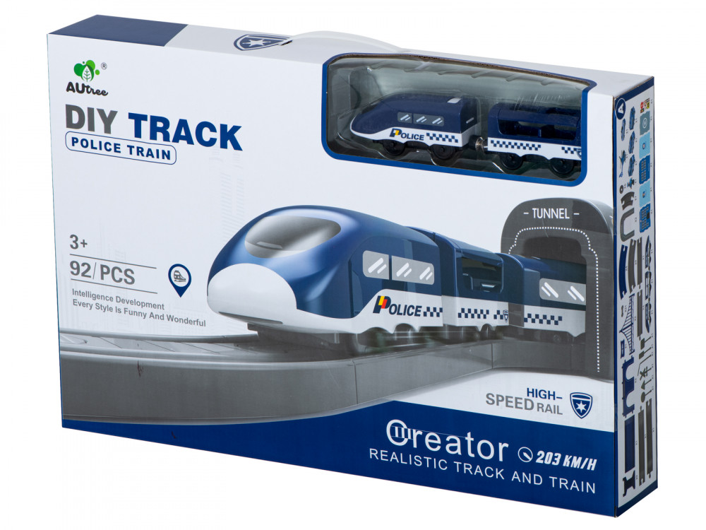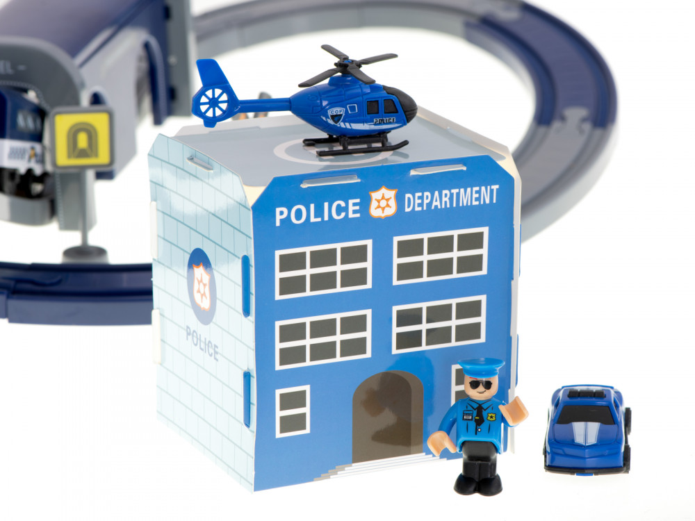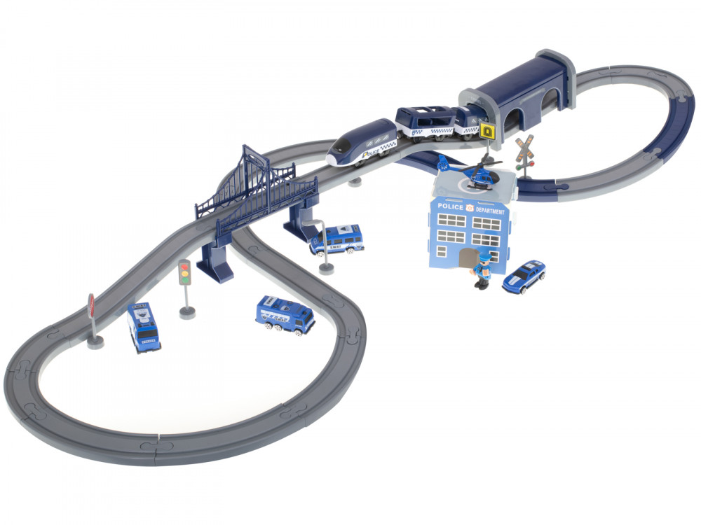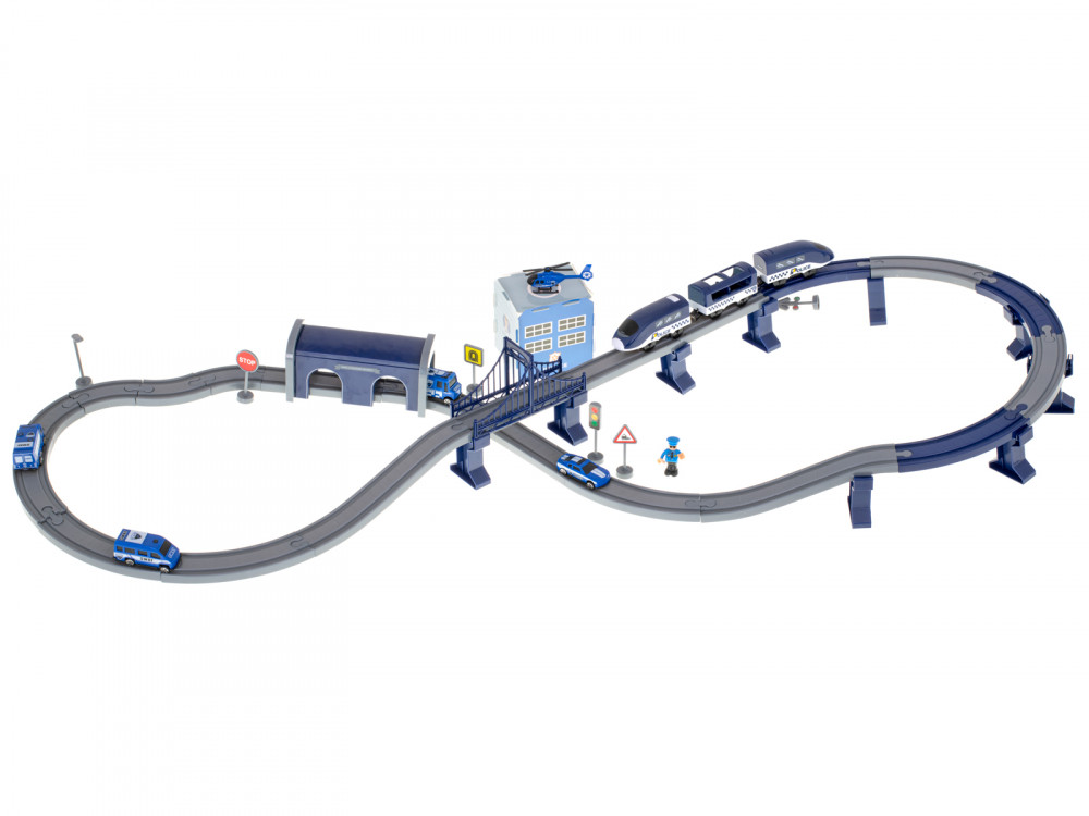 Egy nagy, rendőrségi témájú elektromos vonat. Ez a játék a fiatalabb és idősebb felhasználóknak egyaránt örömet okoz. A játék fejleszti a térbeli tájékozódást, a technikai érzéket és a képzelőerőt. Tápegység: 2 AAA elem. A készlet 92 elemet tartalmaz, többek között: helikopter, alagút.