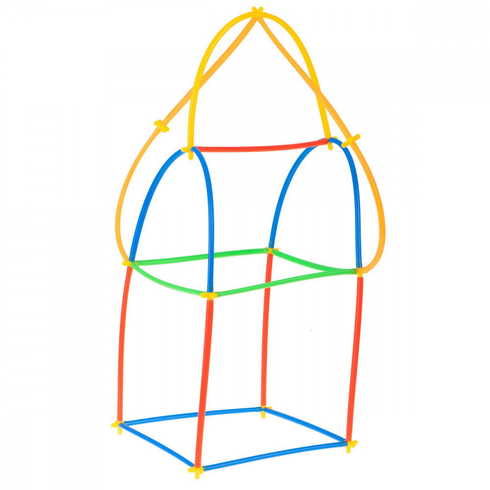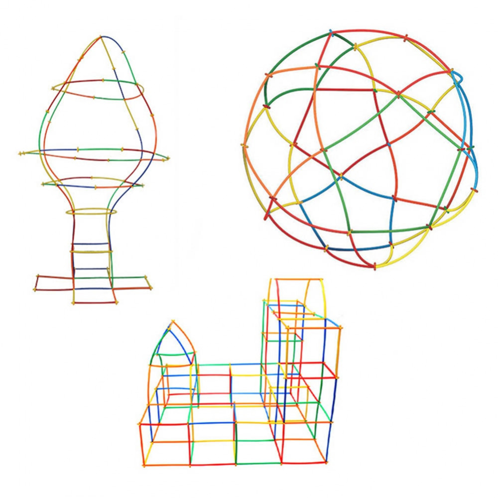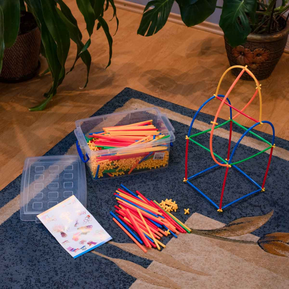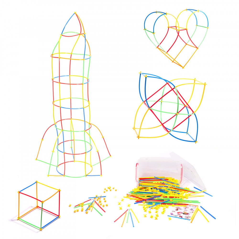 Műanyag és színes építőipari szívószálakból álló készlet dobozban. A játék lehetővé teszi a logikus gondolkodás, a kézügyesség és a türelem tanulását. A készlet összesen 700 darabot tartalmaz, azaz szívószálakat és csatlakozókat. A szívószálak hossza: 6 és 17 cm.