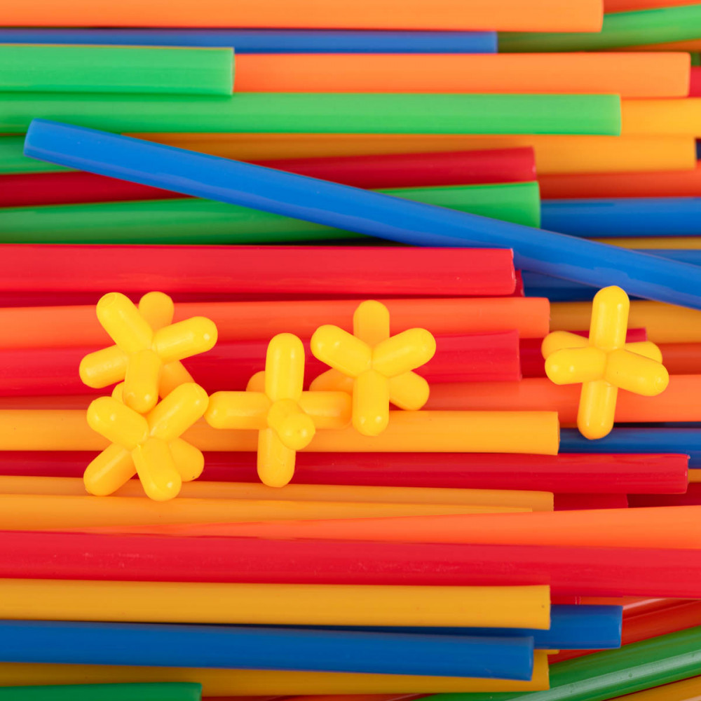Műanyagból készült, többszínű építőipari szívószálakból álló nagy készlet.