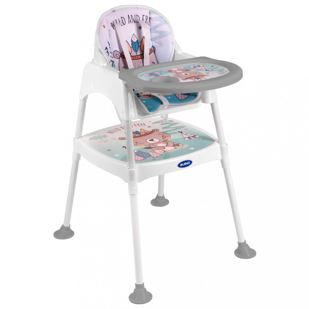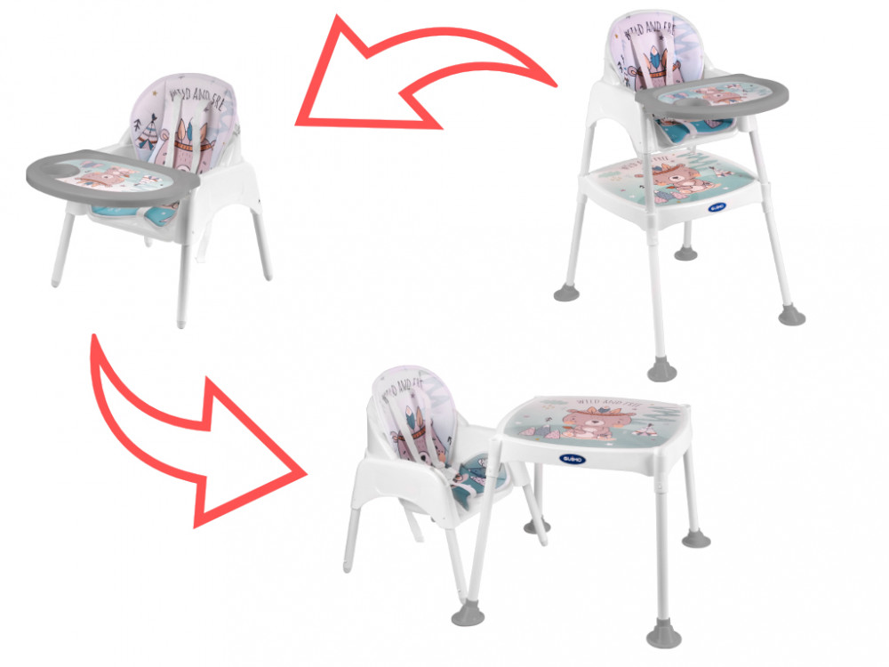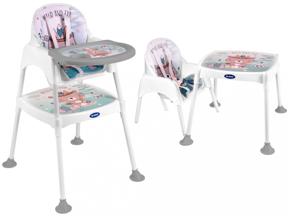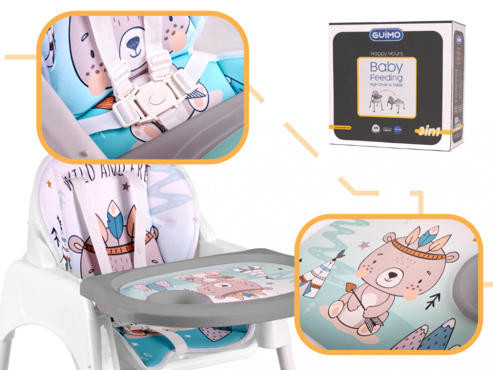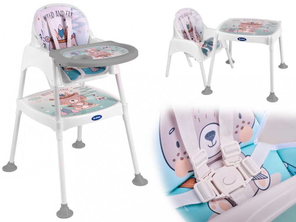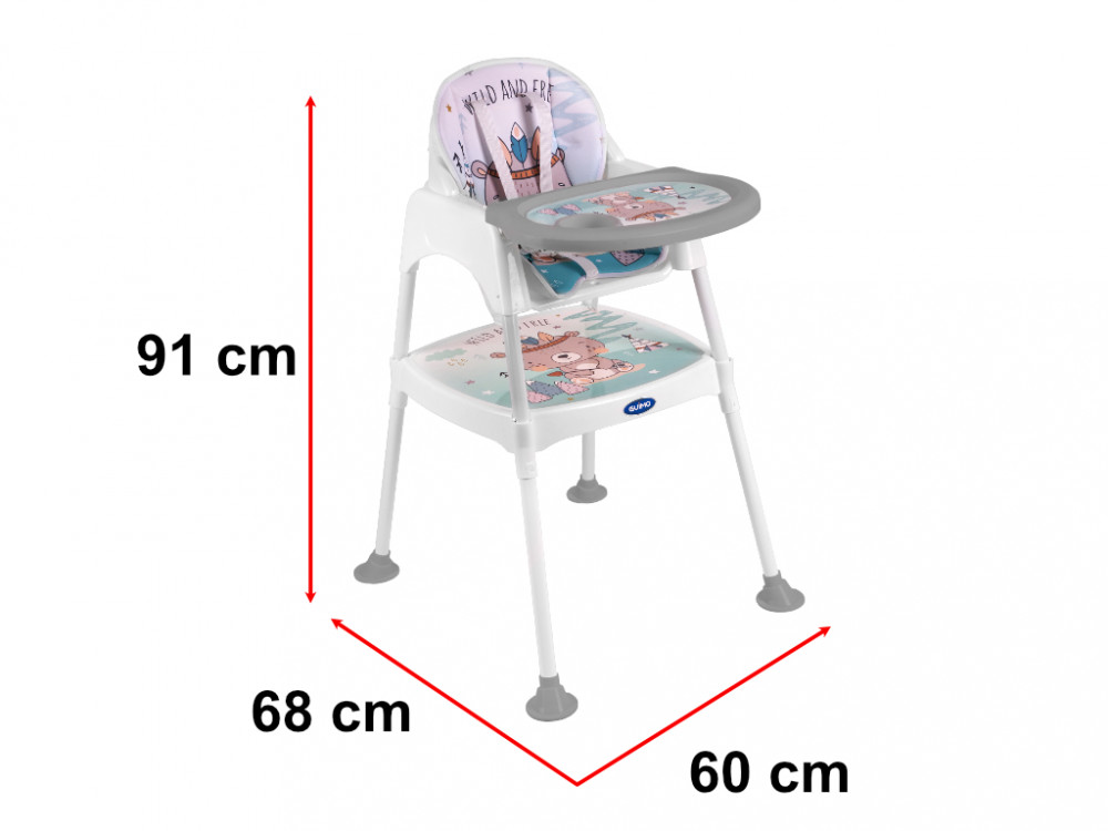 Szuper 3 az 1-ben etetőszék. Három különböző funkcióval rendelkezik: etetőszék, etetőszék és asztal. Az aranyos dizájn vonzza majd a kicsik figyelmét. A puha borítás kényelmes étkezést biztosít a kicsinek. Asztallap méretei: 45x47.5cm. Szék magassága: 91 cm.