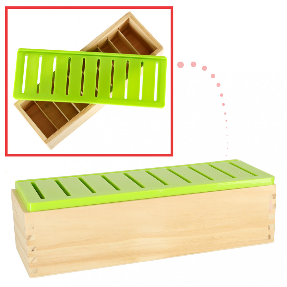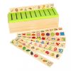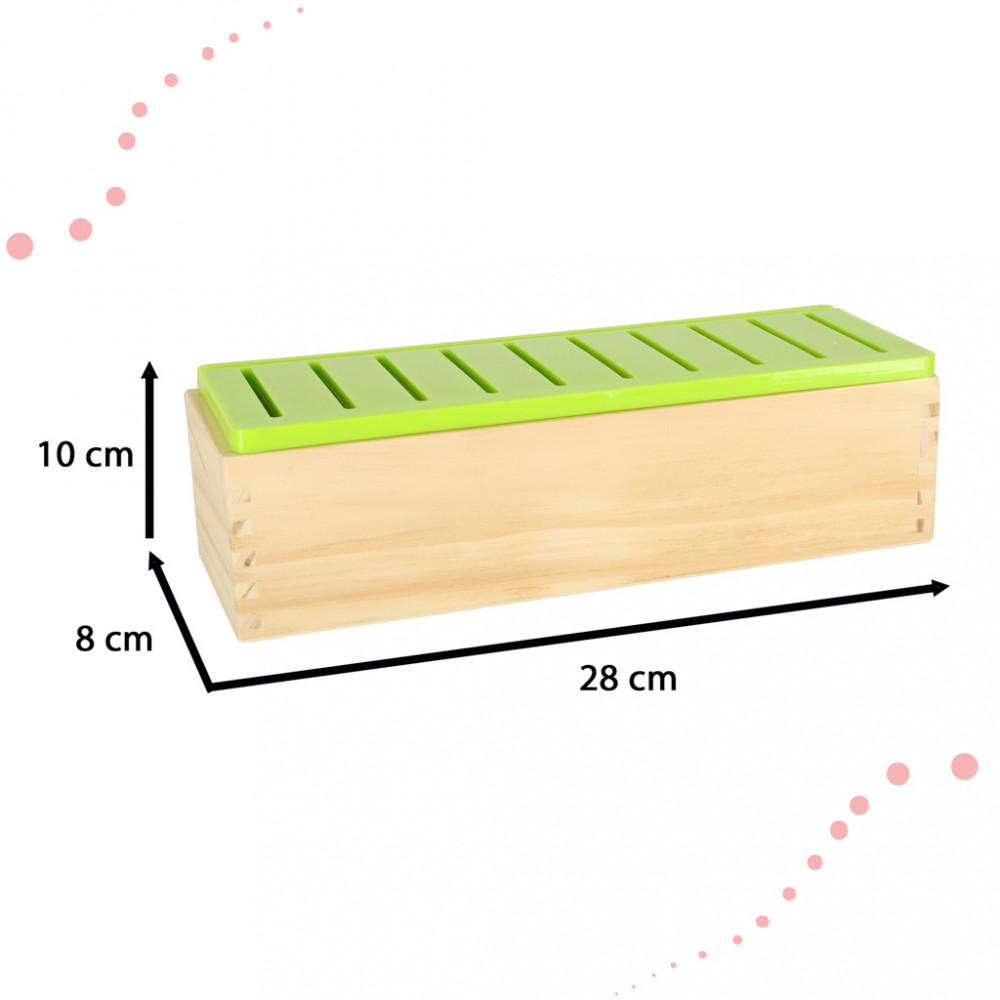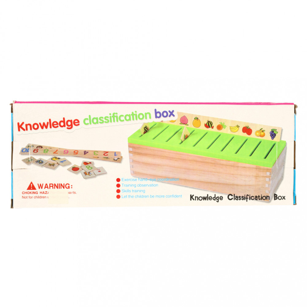 Oktatási szortírozó-puzzle fadoboz formájában. Ez magában foglalja a kép illesztését és a lyukba helyezését. A játék segít megtanulni az angol szavakat. A készlet a következőket tartalmazza: doboz és kétféle tányér képekkel. Méretek: 28x10x8cm.