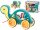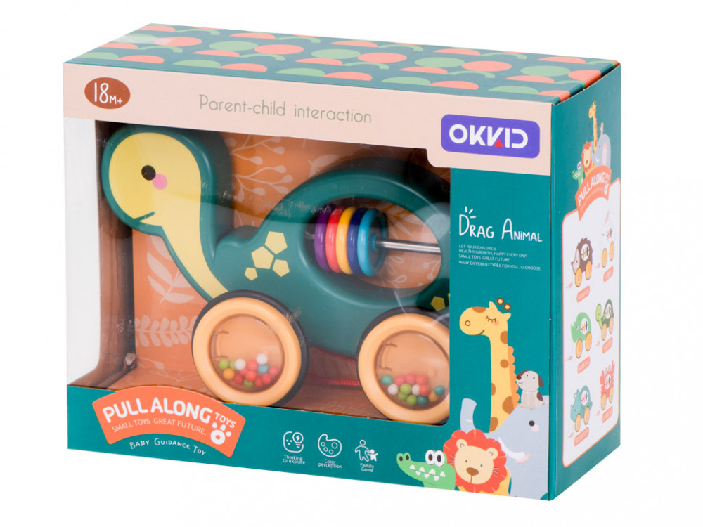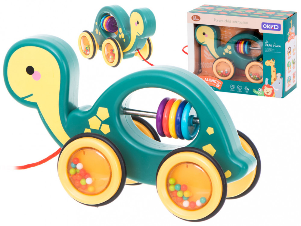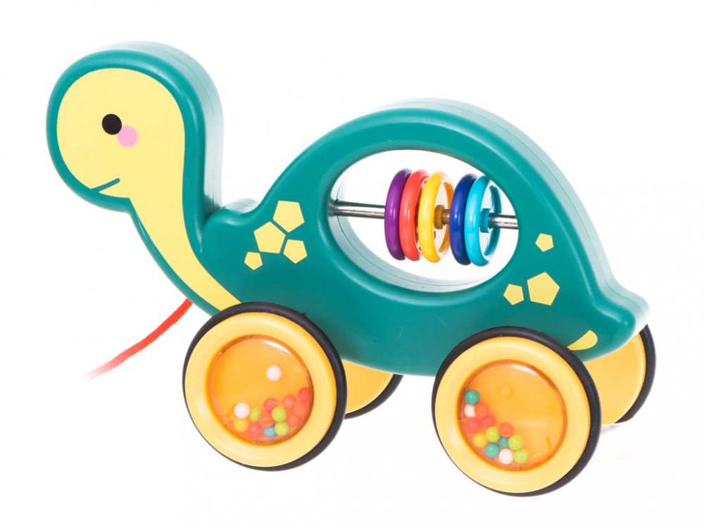 Teknősbéka alakú fa játék. A kerekek golyókat tartalmaznak, amelyek menet közben zörögnek. Belül az öt színes kerék egymástól függetlenül mozgatható. A hosszú zsinór lehetővé teszi, hogy a játékot például sétálni vigye. Teknős méretek: 19.5x9x12.5cm.