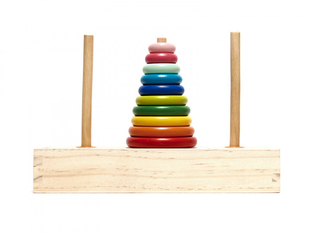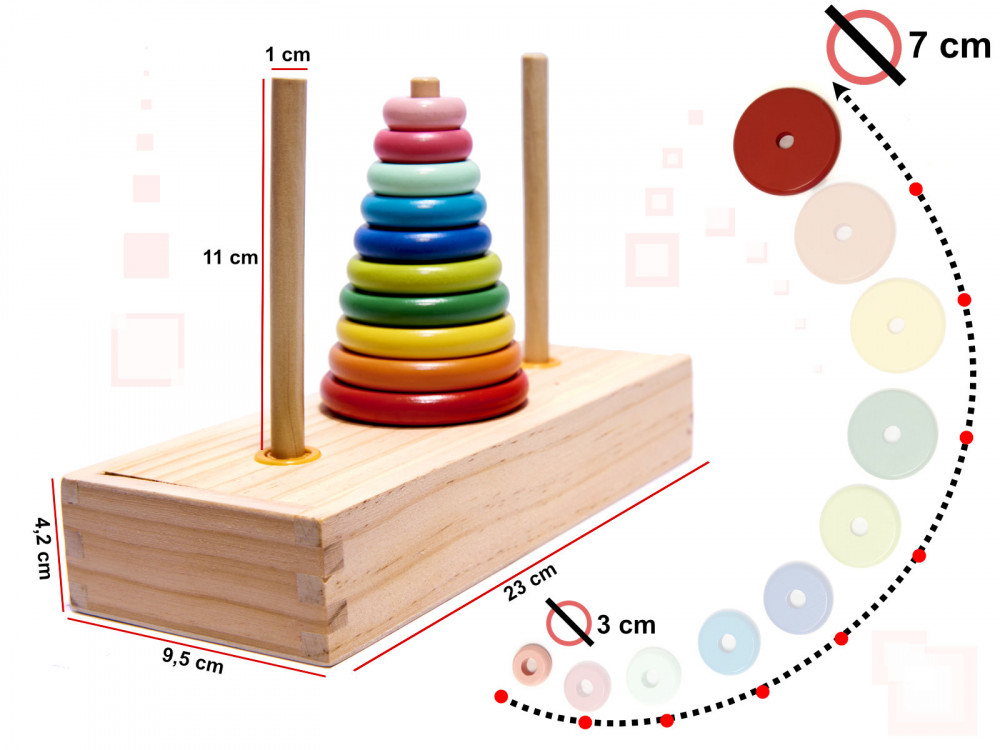 JÁTÉKSZABÁLYOK: az összes korongot a legnagyobbtól a legkisebbig sorrendben kell elhelyezni az első toronytól az utolsó toronyig, a középsőt használva. Az utolsó toronyban a korongokat ismét a legnagyobbtól a legkisebb felé kell elrendezni. Egyszerre csak egy korongot lehet átrendezni, betartva azt a szabályt, hogy a kisebb korong mindig a nagyobbra kerül.