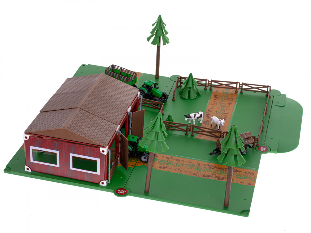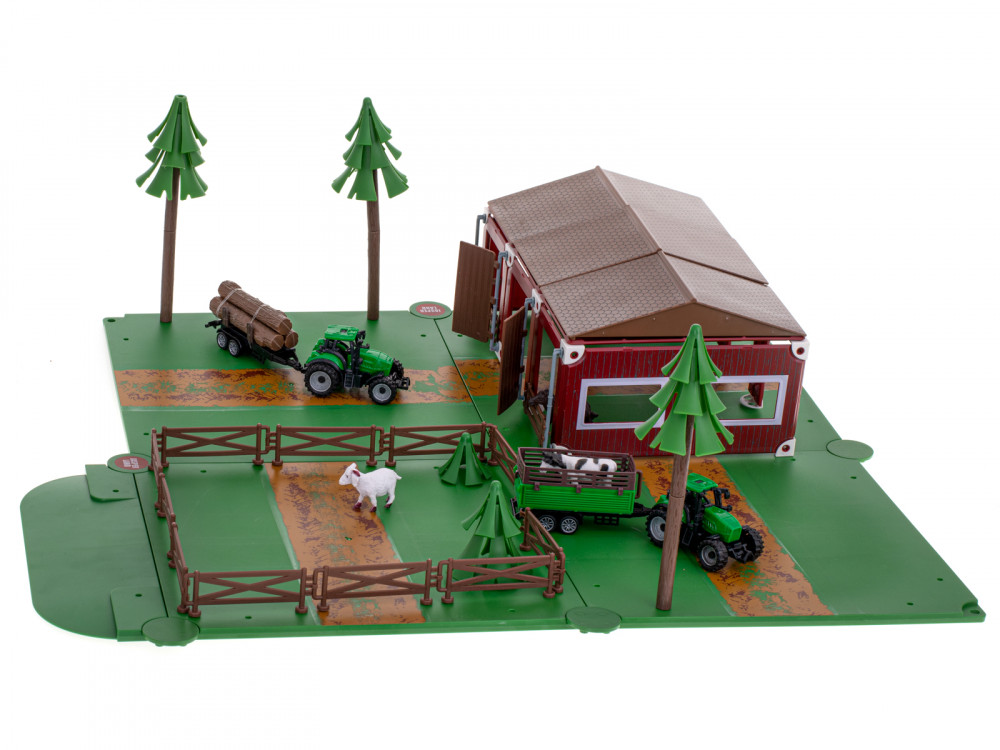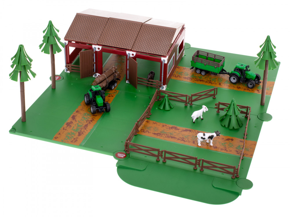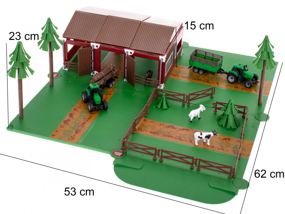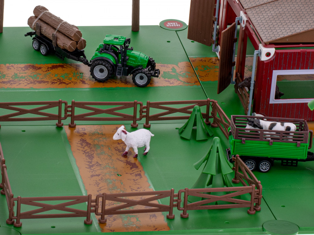 Egy nagy farm állatokkal. A készlet pozitív hatással van a gyermek szellemi fejlődésére. Lehetővé teszi a vidéki élet valóságának megismerését. A készlet 102 elemet tartalmaz, pl.: traktorok, fák, tehén, ló. Anyaga: műanyag. A tábla méretei: 54x62.5cm. A traktor méretei: 8x4.7x4.5cm.
