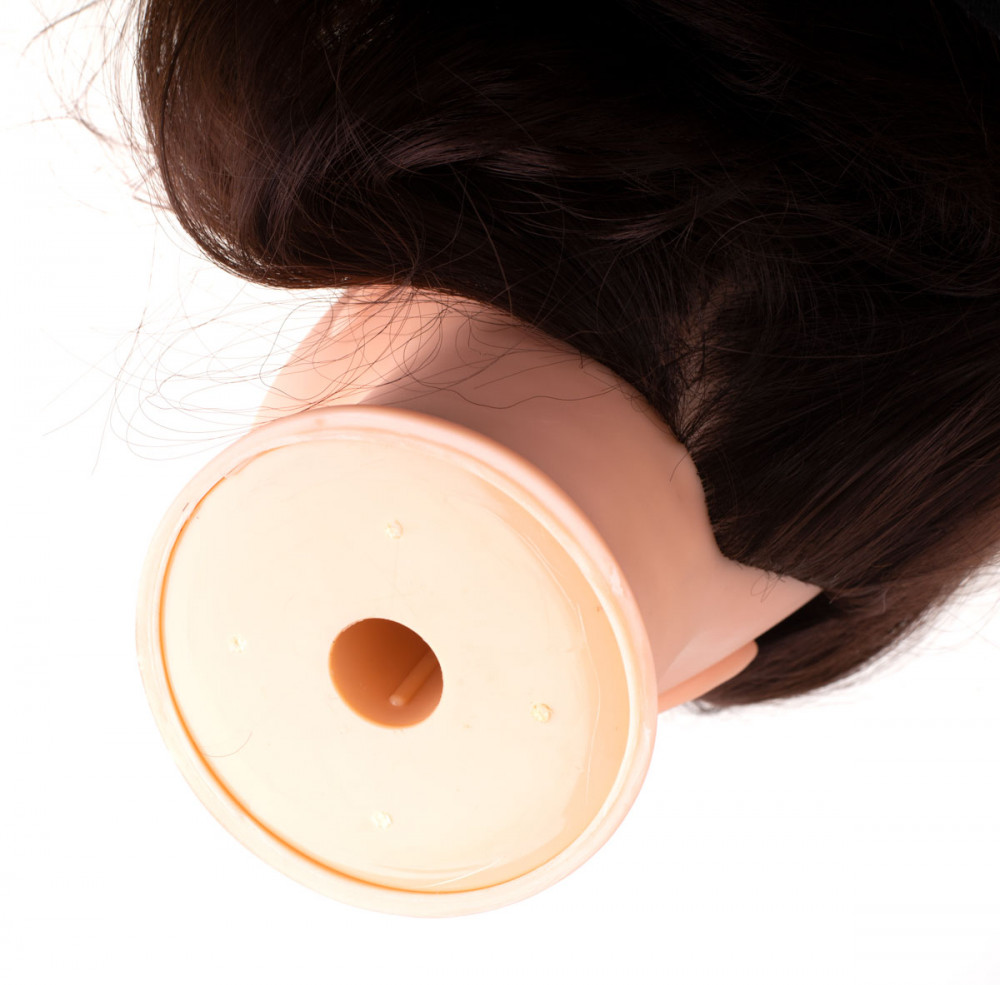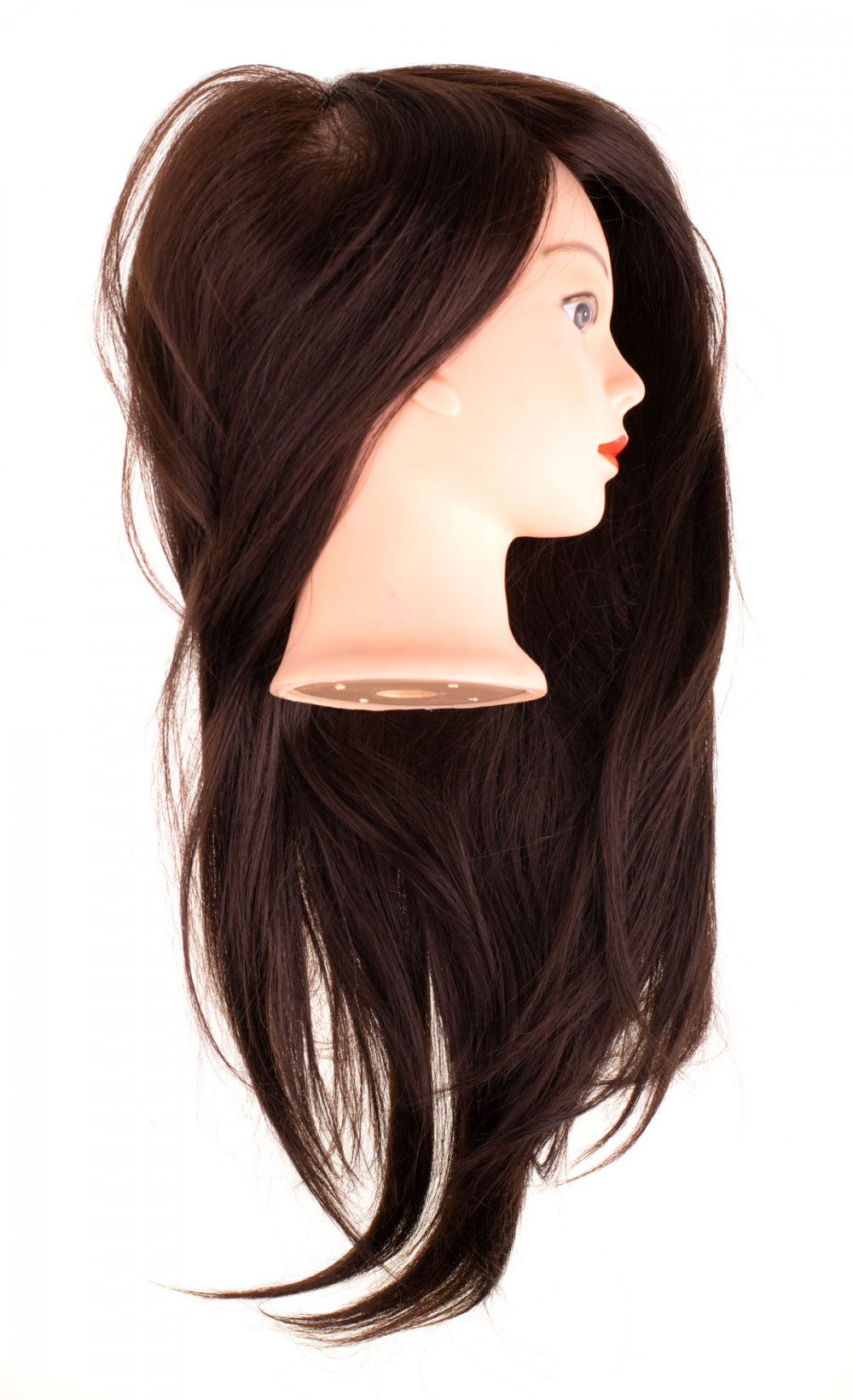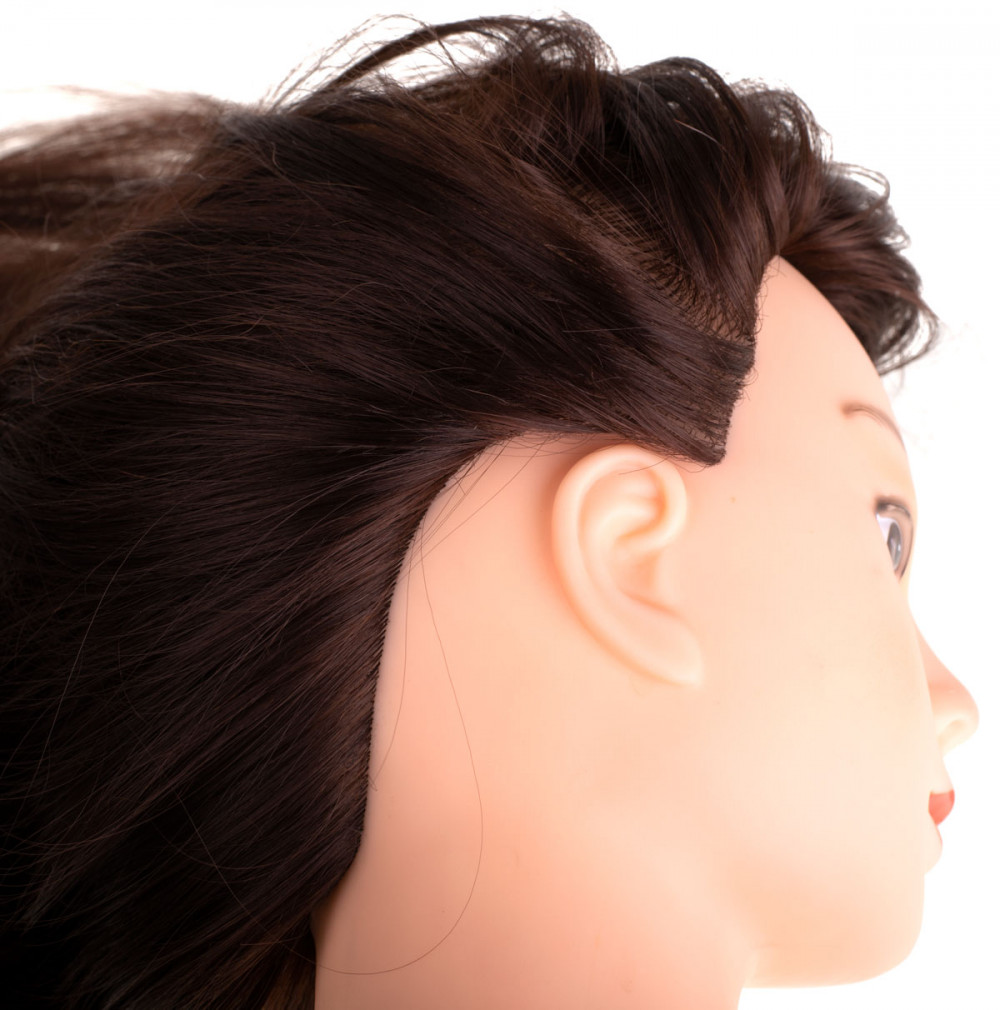 Fodrász gyakorlófej természetes hajjal. Sok könnyebb és fejlettebb frizura is elvégezhető rajta. A modell nem tartalmaz fogantyút. Hajszín: barna, hossza kb. 60-70 cm. Fóliába csomagolva.