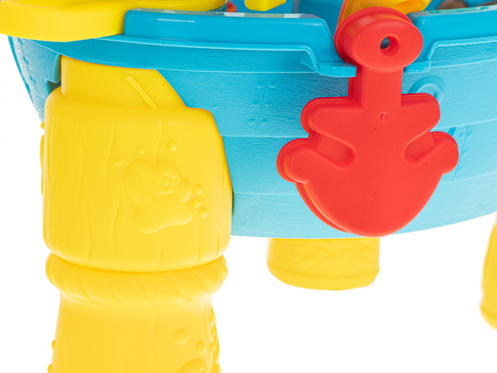 Oktatási homokasztal homokos kiegészítőkkel. A kalózhajót imitáló asztal remek ötlet a szabadtéri játékhoz. Tartalmazza: homokozó, lapát, gereblye, szűrő, 2 forma, kalóz. Anyag: műanyag. Az asztal méretei: 45.5x30.5x57.5cm.