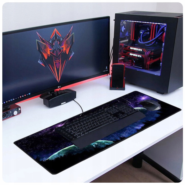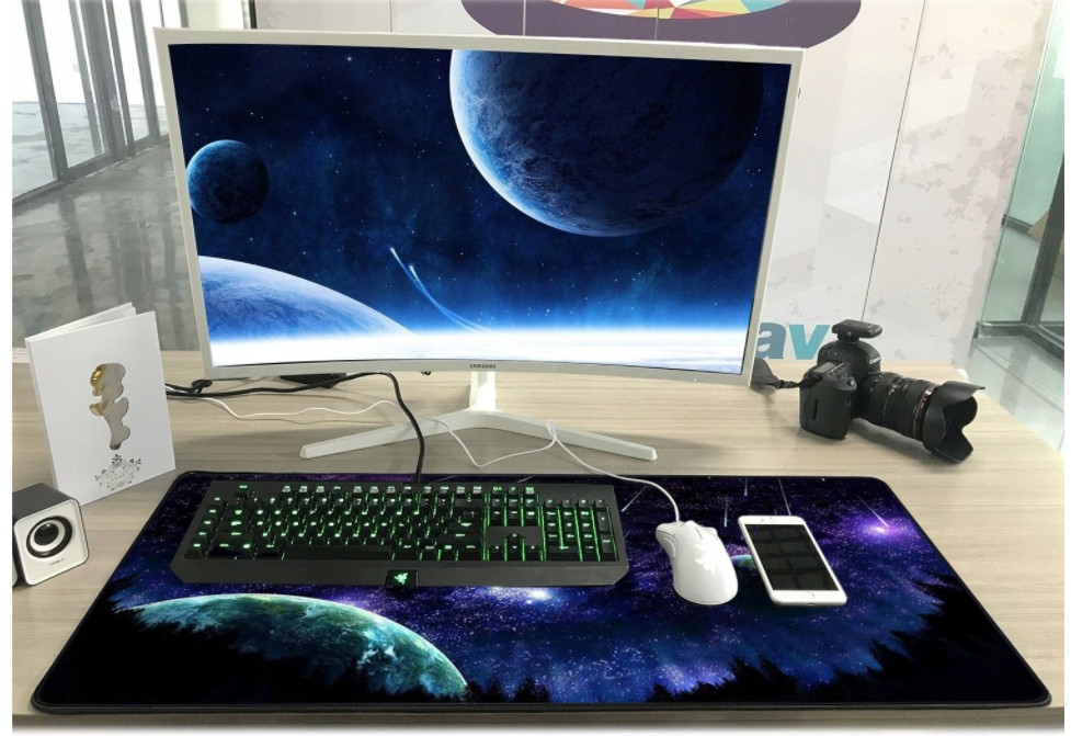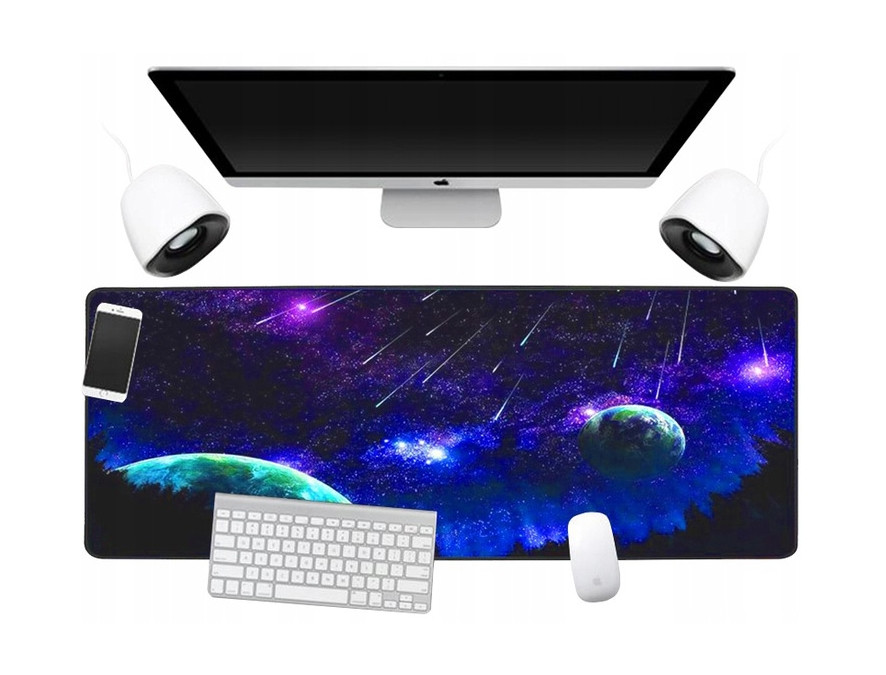 A nagyméretű egérpad javítja az íróasztalnál és a számítógépen végzett munkáját. A kb. 90 x 40 centiméteres méretével a szőnyeg elég nagy ahhoz, hogy megvédje az asztallap teljes felületét. A szőnyeg puha bevonata kényelmet biztosít a kezeknek. A szőnyeg felületén található, esztétikus galaxisminta tökéletesen illeszkedik a legtöbb belső térbe. A szőnyeg tökéletes kiegészítő lesz a legkisebbek szobájában.
