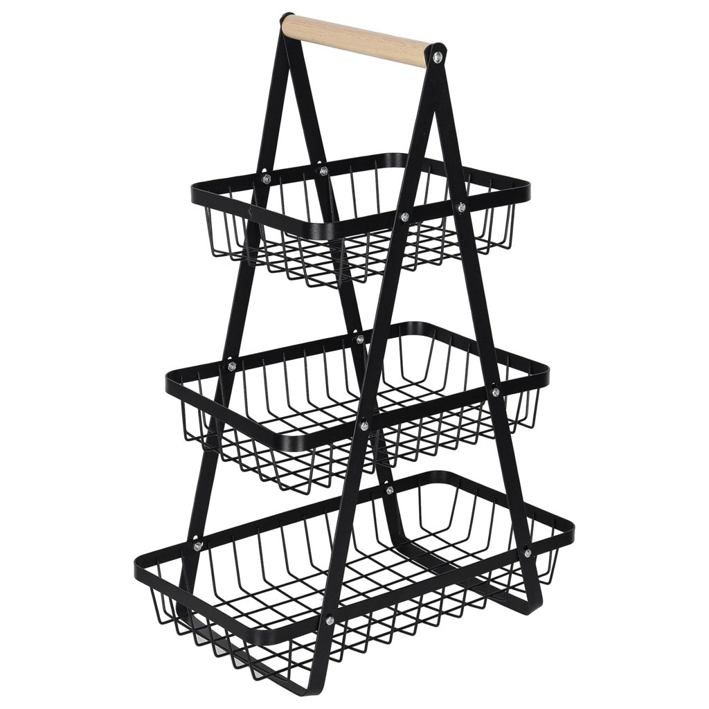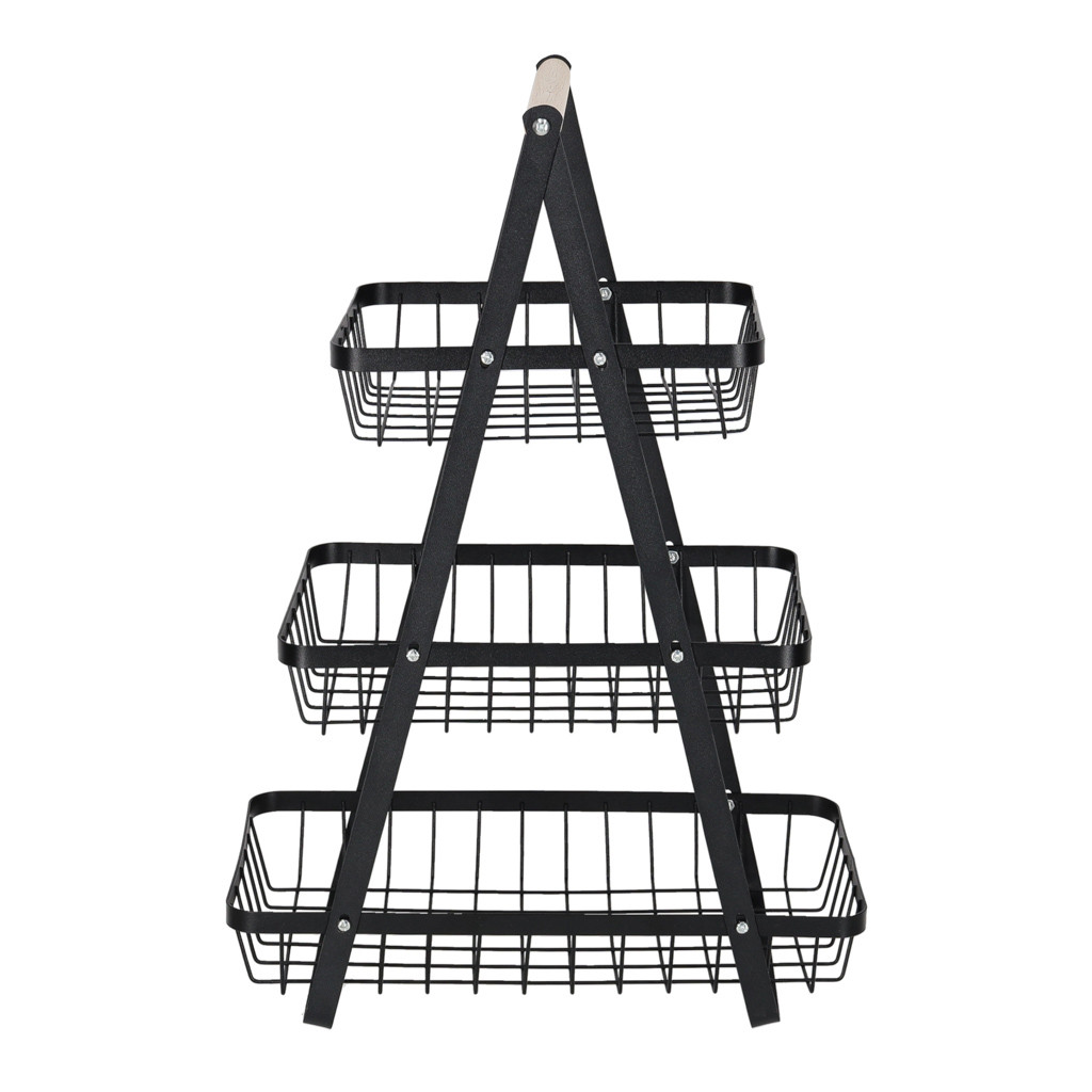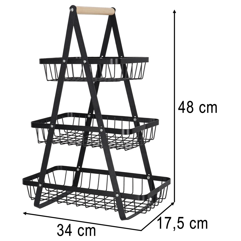 Gyümölcskosár fekete háromszintes fém kosár fa