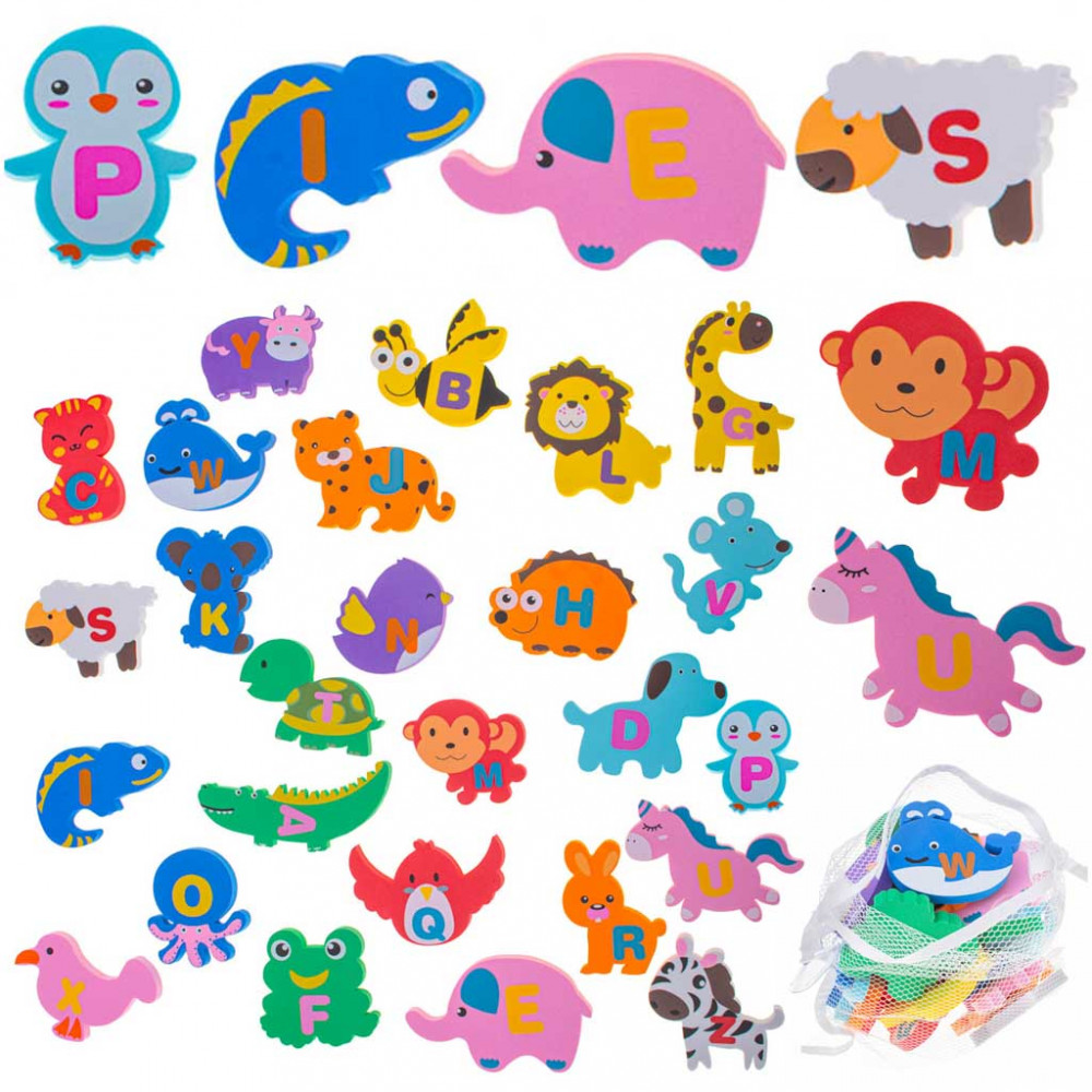 Puha habos rejtvények a fürdőbe. Minden puzzle egy-egy állatot és betűt ábrázol - vagyis a készlet remek lehetőség a betűk és az állatok nevének megtanulására. Minden fürdési időt fantasztikus kalanddá tesznek. A minta puzzle méretei: 11x7x1 cm.