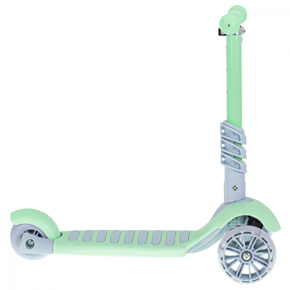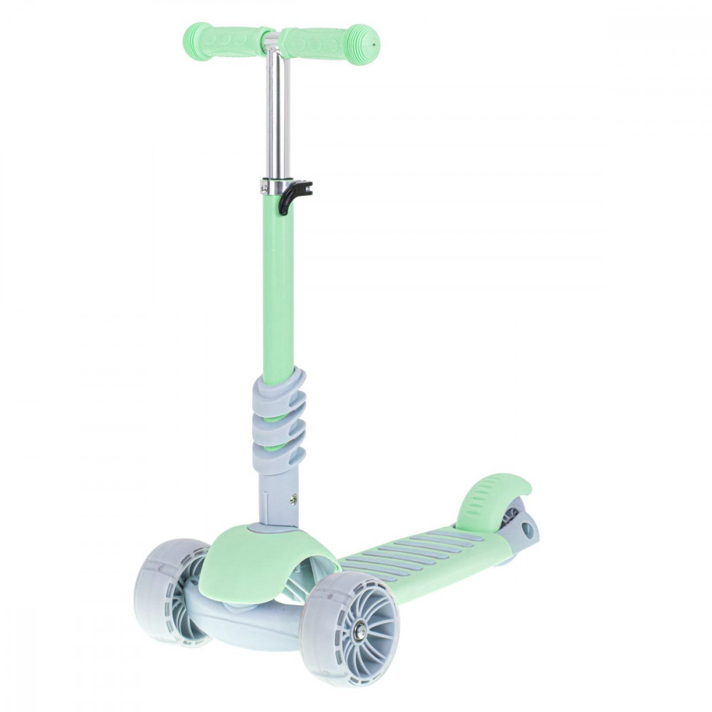 Háromkerekű jármű, amely robogóként, lovasként és gördeszkaként funkcionál. 3 fokozatú ülésmagasság-állítással rendelkezik. LED-es lámpákkal ellátott kerekekkel felszerelve. Hátsó fékkel rendelkezik. Menta színben kapható. Alumíniumból, műanyagból és gumiból készült.
