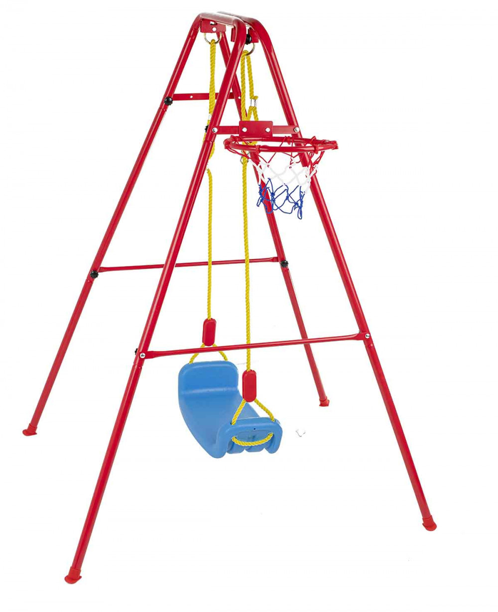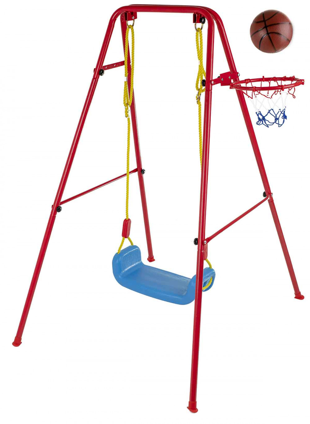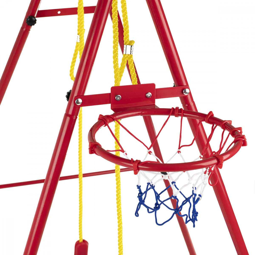 Kosárral felszerelt hinta kosárlabdázáshoz. Fém elemekből és műanyag ülésből készült. Tökéletes az aktív kikapcsolódáshoz a kertben vagy otthon. A készlet a következőket tartalmazza: hintaelemek, kosár, háló, labda és pumpa. Teljes magasság: 130 cm.