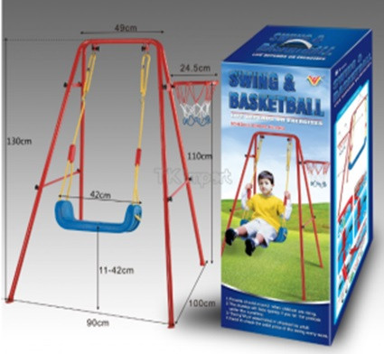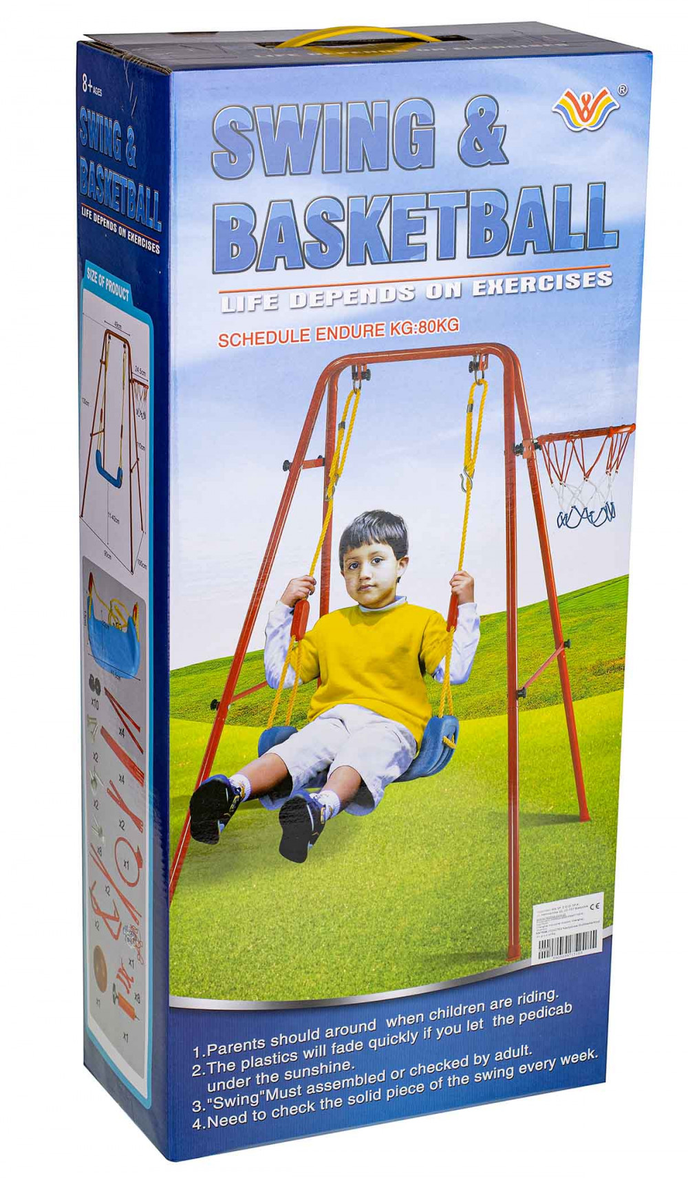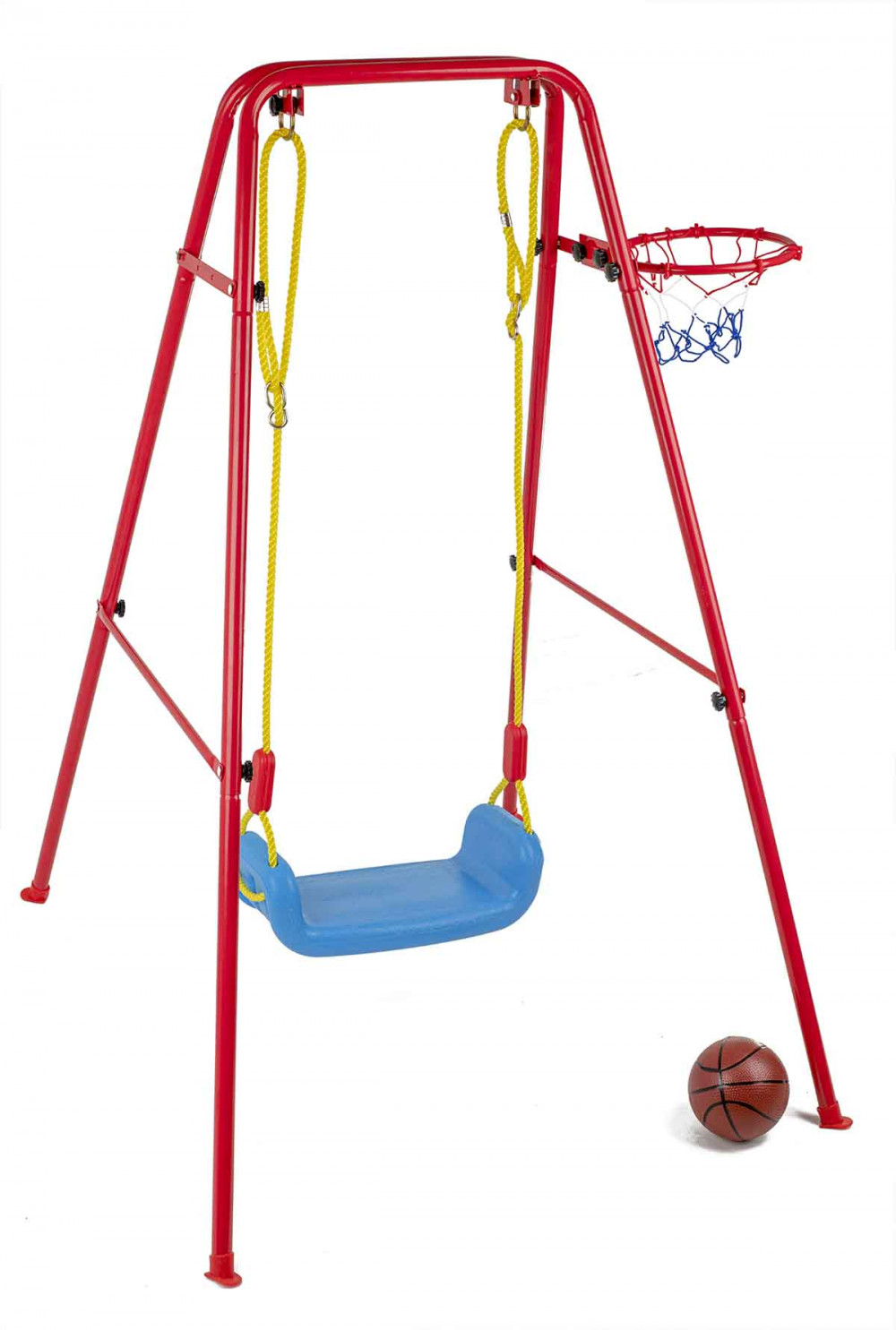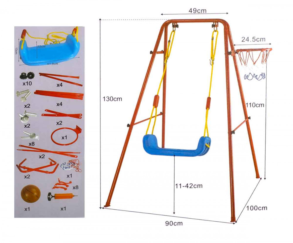Kosárral felszerelt hinta kosárlabdázáshoz. Fém elemekből és műanyag ülésből készült. Tökéletes az aktív kikapcsolódáshoz a kertben vagy otthon. A készlet a következőket tartalmazza: hintaelemek, kosár, háló, labda és pumpa. Teljes magasság: 130 cm.