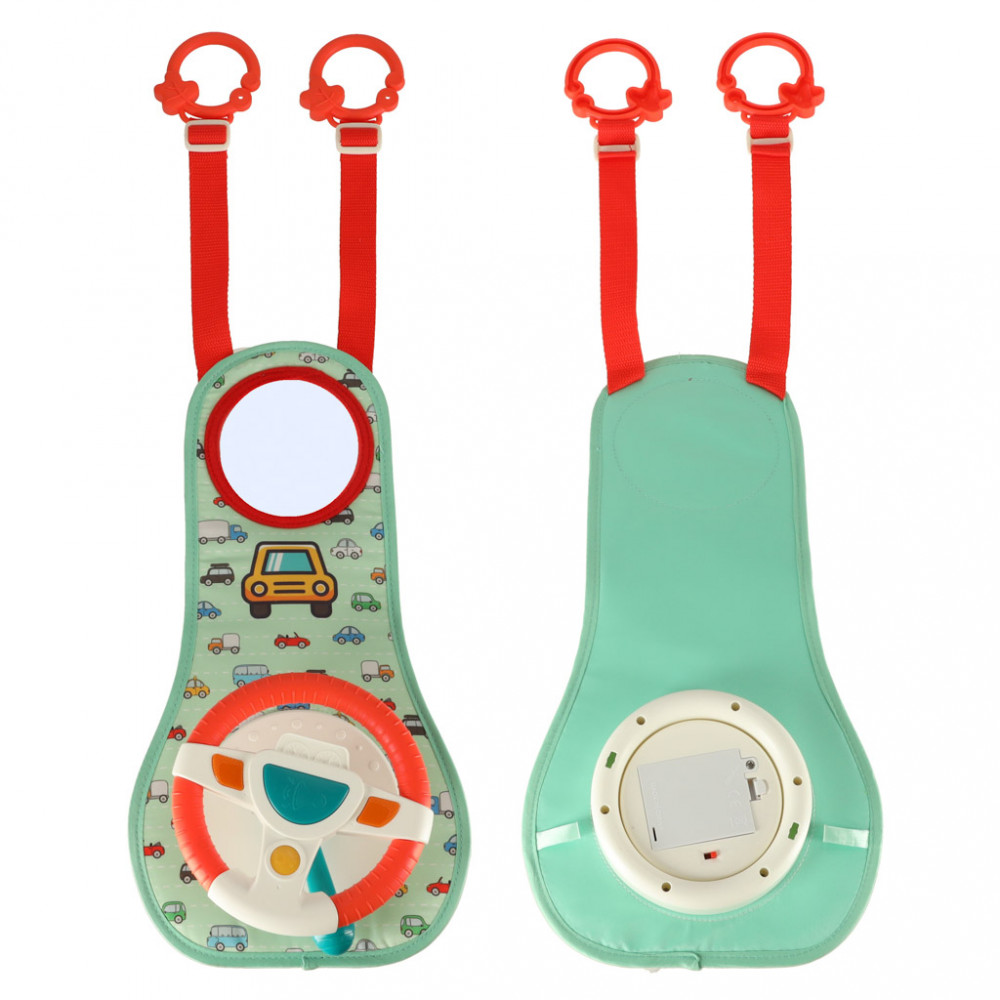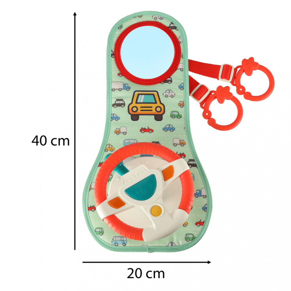 Interaktív kormánykerék, amely az autóba szerelhető. Ideális a kisgyermekkel való utazáshoz. Tápegység: 3x AA 1,5V-os elem (tartozék). Kormánykerék méretei: 40x20cm. Biztonsági tükör átmérője: 10 cm.