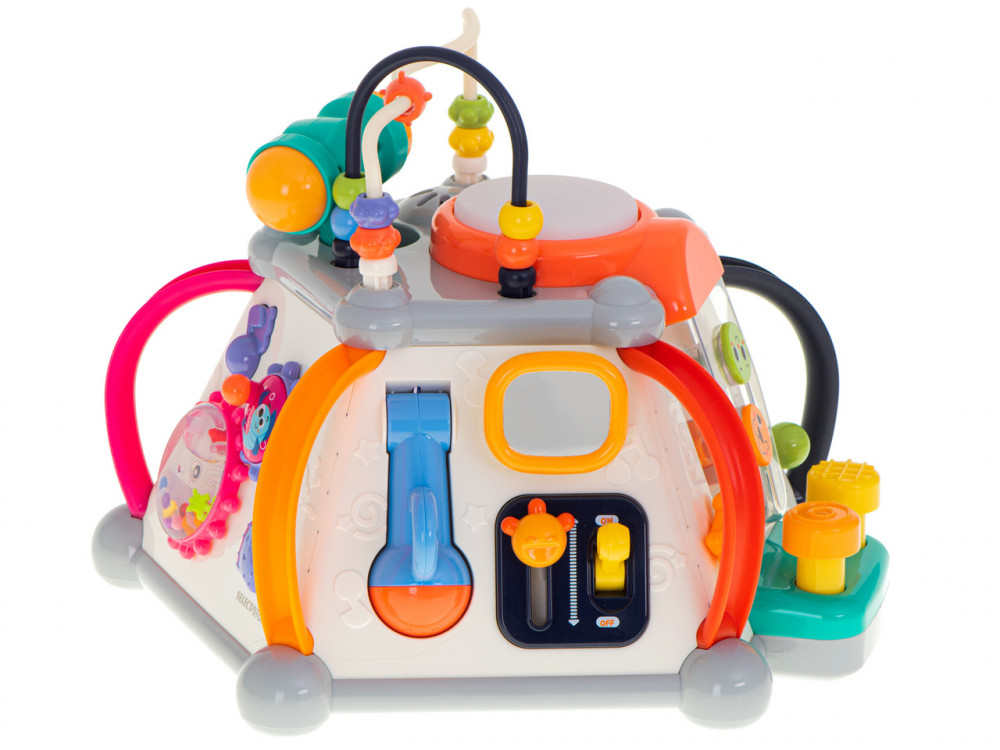 Az interaktív kocka a gyermek megfelelő fejlődésének támogatásával kombinált nagyszerű szórakozást kínál, amely során a kisgyermek logikus gondolkodási készségeket és az ujjak kézügyességét fejleszti.