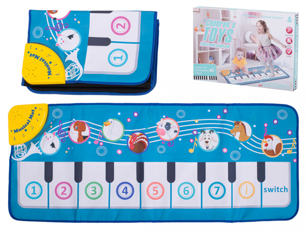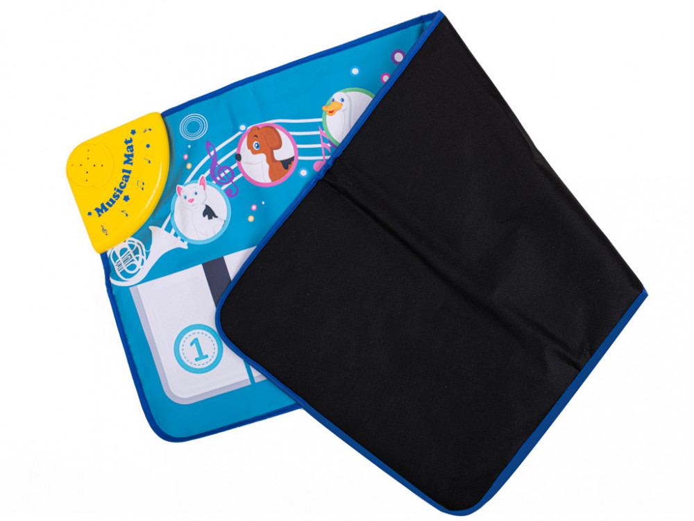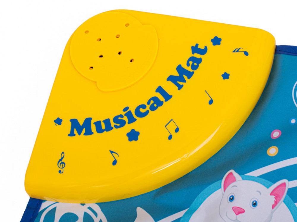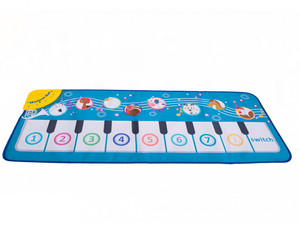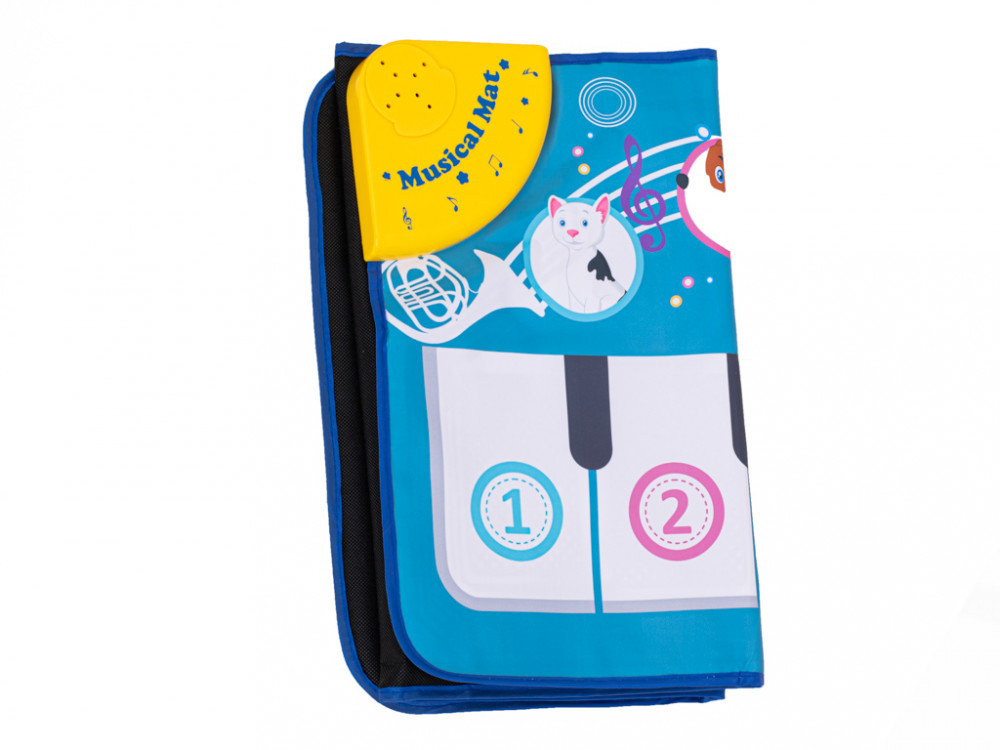 Interaktív zongora - táncszőnyeg. Két panelje van: egy zongora különböző dallamokkal és gombok állathangokkal. A kellemes színek játékra ösztönzik gyermekét. Akkumulátorral működik: 3x AA (nem tartozék). Méretek: 100x40cm.